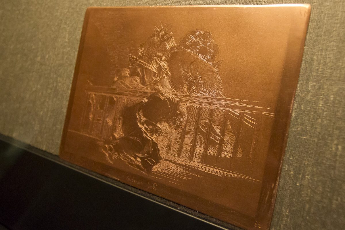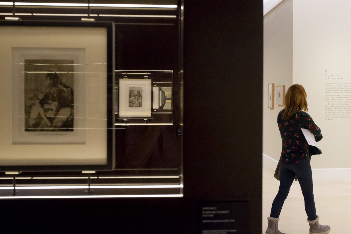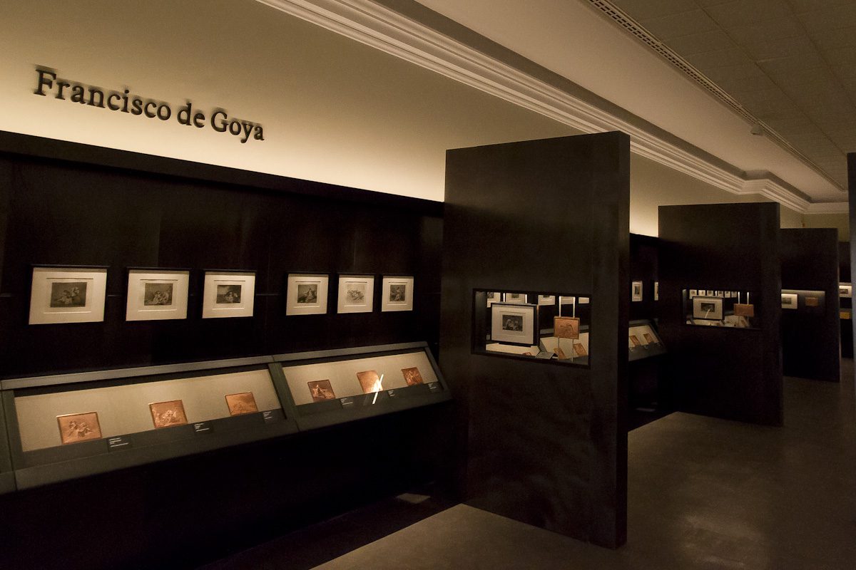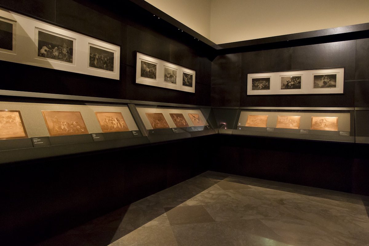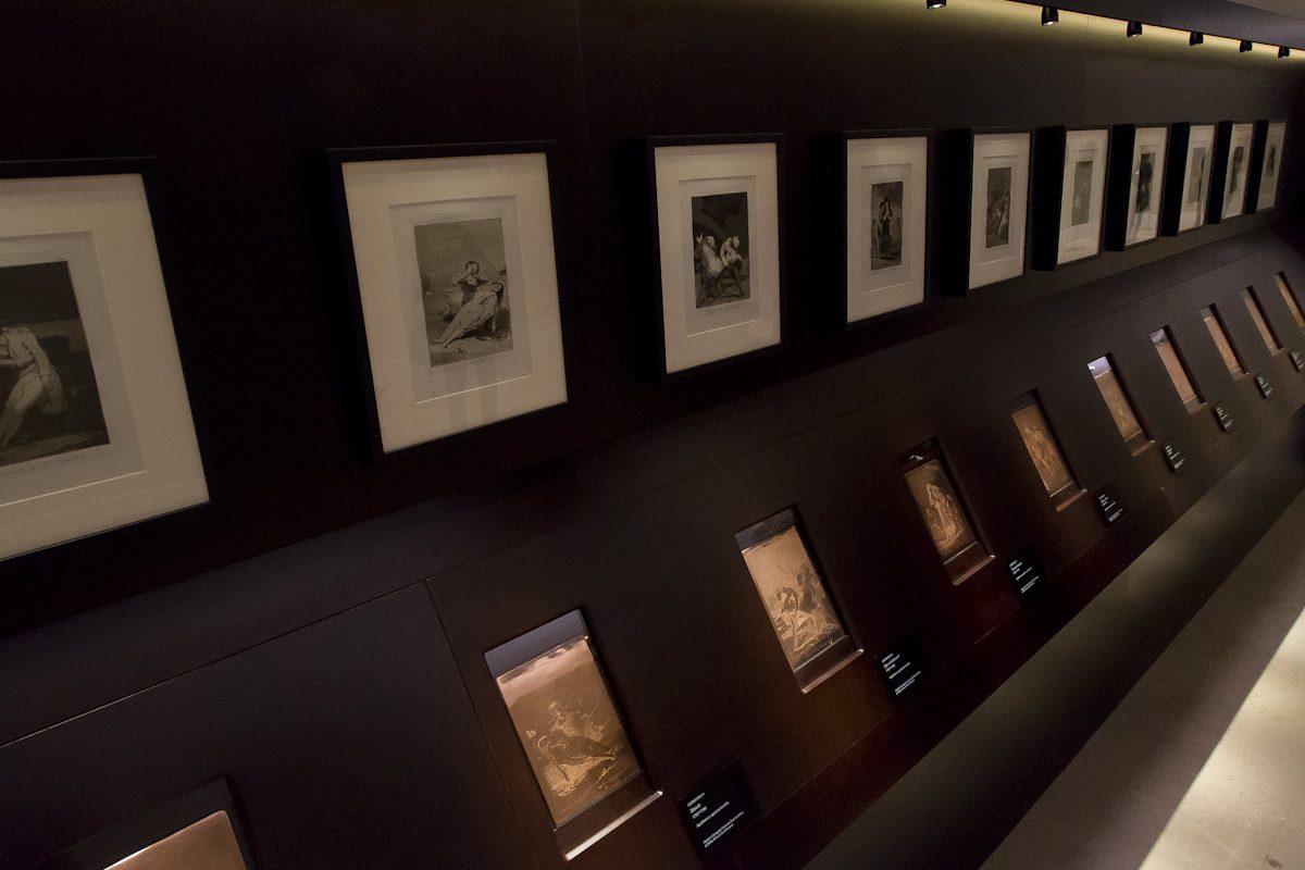 En la obra de Goya se aprecia su racionalismo crítico ante la sociedad, la guerra y las normas sociales y artísticas establecidas, y la práctica del grabado es el medio propicio con el que se libera del encorsetamiento de los encargos, pudiendo dar paso al imperio de la expresión. En la exposición se pueden admirar las matrices de cobre originales de las series completas de los Caprichos, Desastres de la guerra y Disparates. Estas matrices calcográficas, al verse libres del baño de acero y cromo que las recubría, pueden ahora contemplarse tal como fueron creadas, apreciándose matices que antes quedaban ocultos. Las creaciones gráficas de Goya que forman parte de la exposición son 80 Caprichos, 82 Desastres de la guerra, 33 Tauromaquias y 18 Disparates, es decir, 213 planchas más sus correspondientes estampas.
