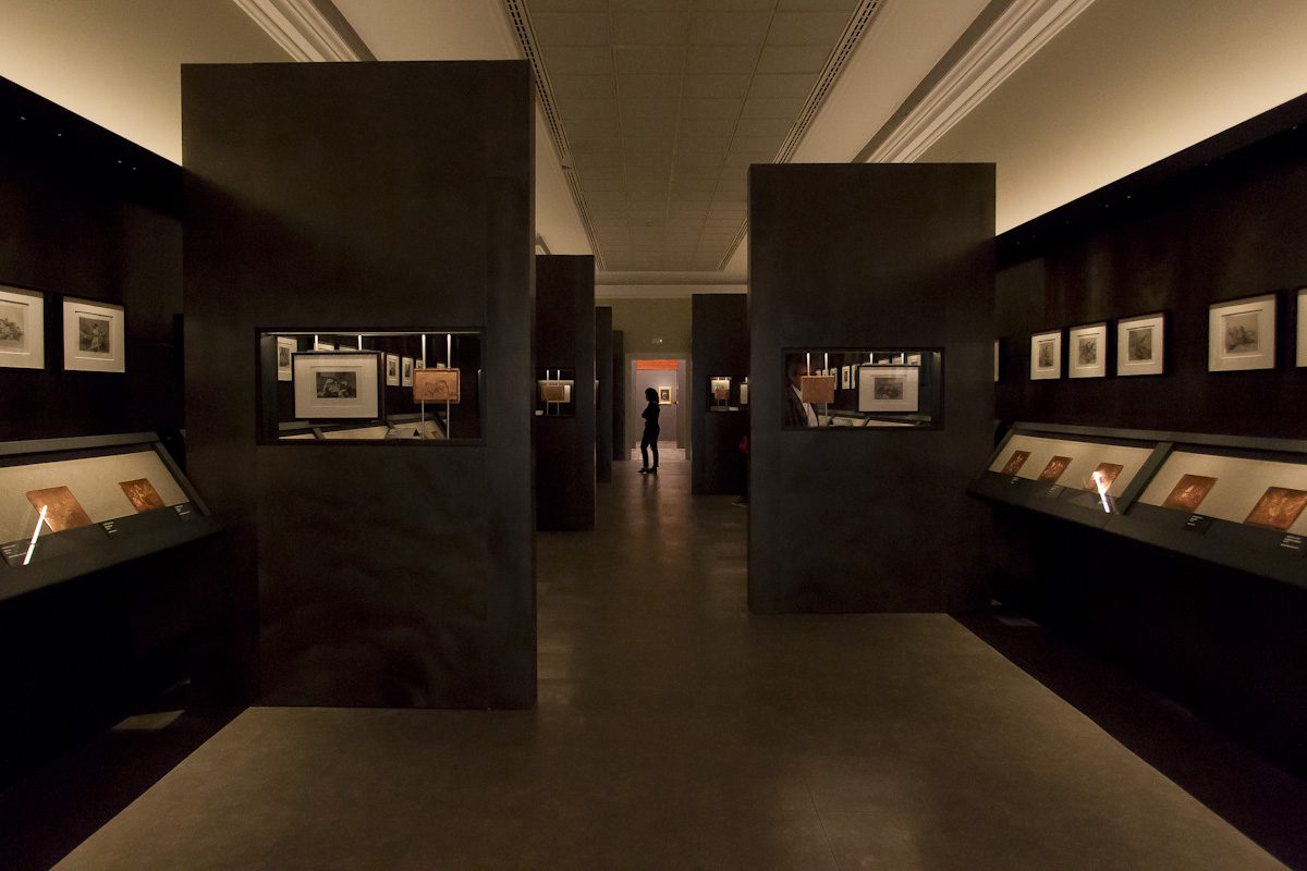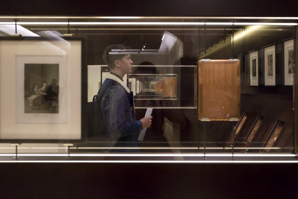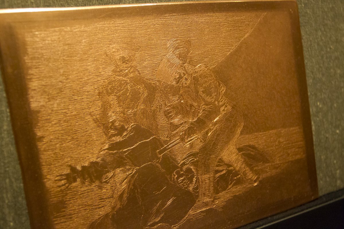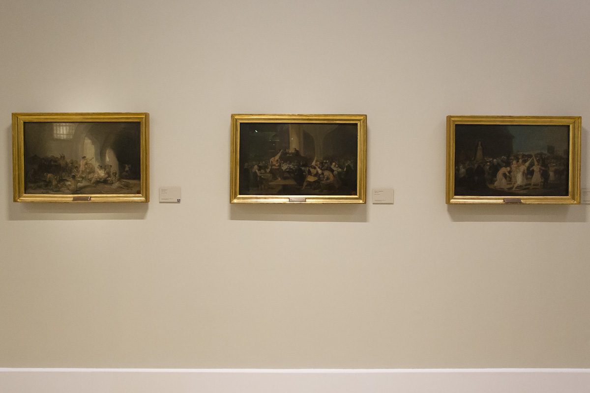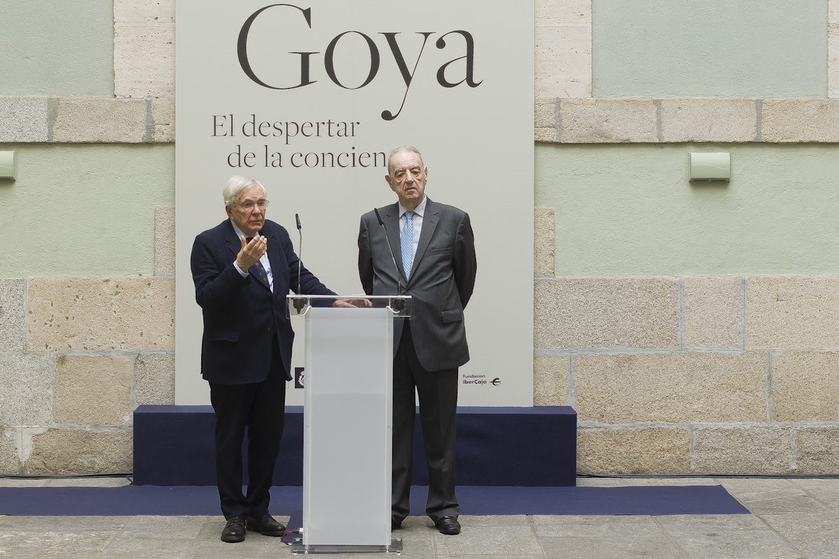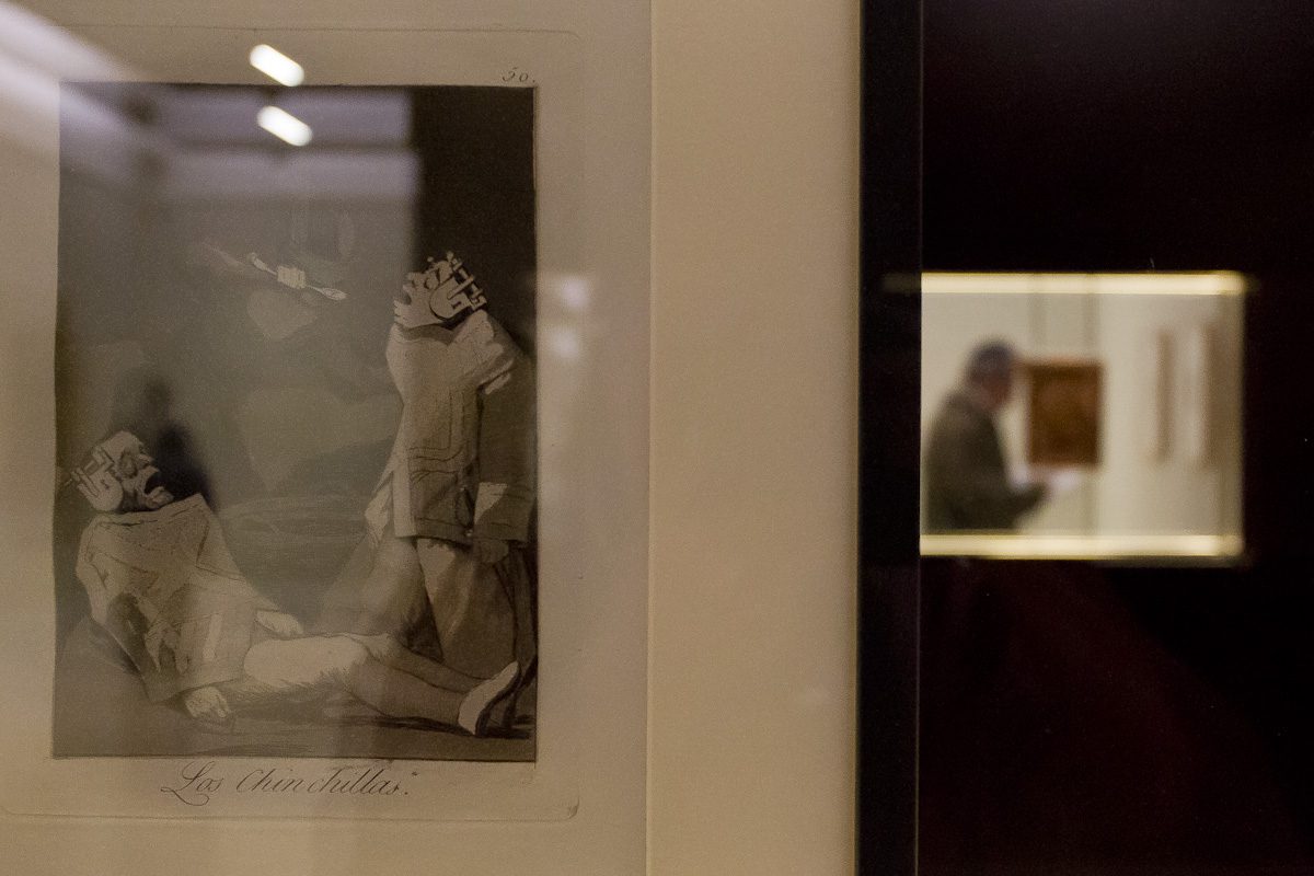 En la obra de Goya se aprecia su racionalismo crítico ante la sociedad, la guerra y las normas sociales y artísticas establecidas, y la práctica del grabado es el medio propicio con el que se libera del encorsetamiento de los encargos, pudiendo dar paso al imperio de la expresión. En la exposición se pueden admirar las matrices de cobre originales de las series completas de los Caprichos, Desastres de la guerra y Disparates. Estas matrices calcográficas, al verse libres del baño de acero y cromo que las recubría, pueden ahora contemplarse tal como fueron creadas, apreciándose matices que antes quedaban ocultos. Las creaciones gráficas de Goya que forman parte de la exposición son 80 Caprichos, 82 Desastres de la guerra, 33 Tauromaquias y 18 Disparates, es decir, 213 planchas más sus correspondientes estampas.