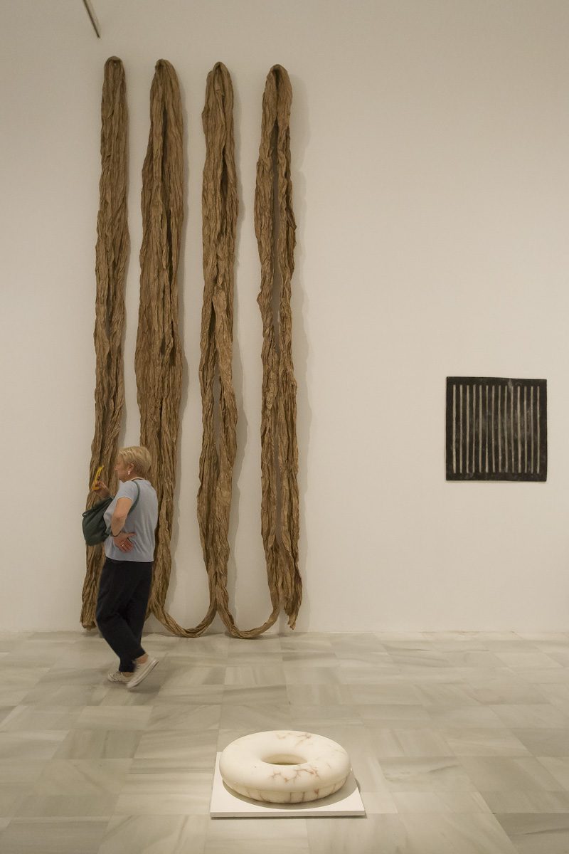 A lo largo de 13 salas, la muestra ofrece más de un centenar de obras cuyo eje es la donación que hizo la artista en 2023 al Museo. Están presentes una selección de las 36 obras donadas y otras procedentes de préstamos, algunas de ellas no vistas hasta la fecha o que se han reconstruido específicamente para la ocasión.