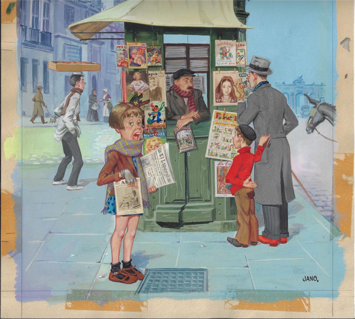 La exposición comienza con sus primeras lecturas, tebeos infantiles donde vería su primer trabajo impreso, un dibujo hecho a los cinco años de su prima, que se publicaría en el número 25 de Macaco. El periódico de los niños, en 1928. Tras la guerra, Jano comenzaría a trabajar como ilustrador en el estudio de Adolfo López Rubio, donde dibujaría tebeos como la popular cabecera Satanás, después rebautizada como Ginesito, inspirada en el actor secundario Ginés Gallego. La exposición recoge algunos de estos trabajos tempranos como dibujante de tebeos, incluyendo el cuaderno El planeta en llamas, publicado en 1944.