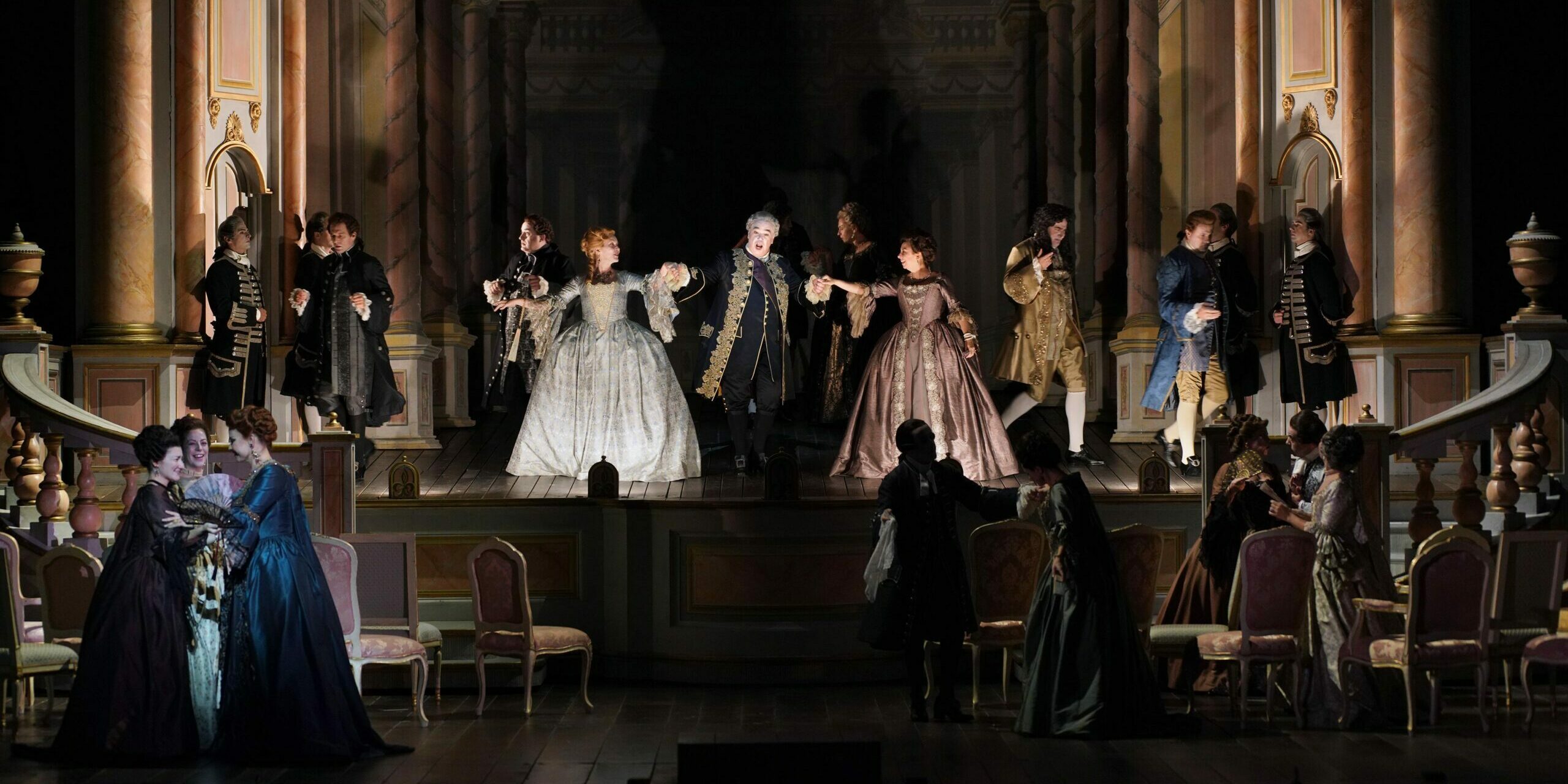 La escenografía de Edwards, con su mezcla de cortinajes, maquinaria teatral y juego de espejos, y el opulento vestuario de Reiffenstuel, crean una atmósfera melancólica anticipando el trágico final, con una paleta cromática dominada por tonos dorados, ocres y púrpuras, que evocan el lujo decadente de la aristocracia y la libertad, siempre marginal, de la vida sobre un escenario.