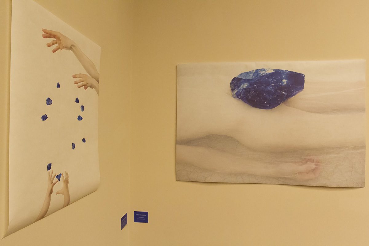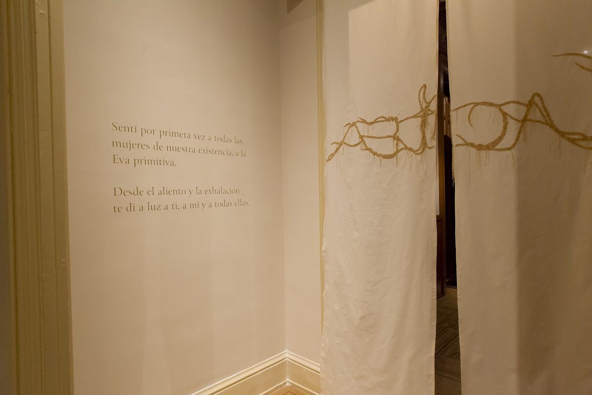 Desde su primera instalación, Velum protector II. Madre jardín, ubicada en el pórtico del Museo, Córdoba teje una narrativa visual y emocional que recorre las salas, combinando elementos naturales y materiales simbólicos que remiten a la protección y el cuidado. El manto azul de esta instalación se convierte en el epicentro de la muestra: un espacio de acogida, un refugio que evoca el hogar original entre madre e hijo, protegiéndolos del vacío del mundo exterior.