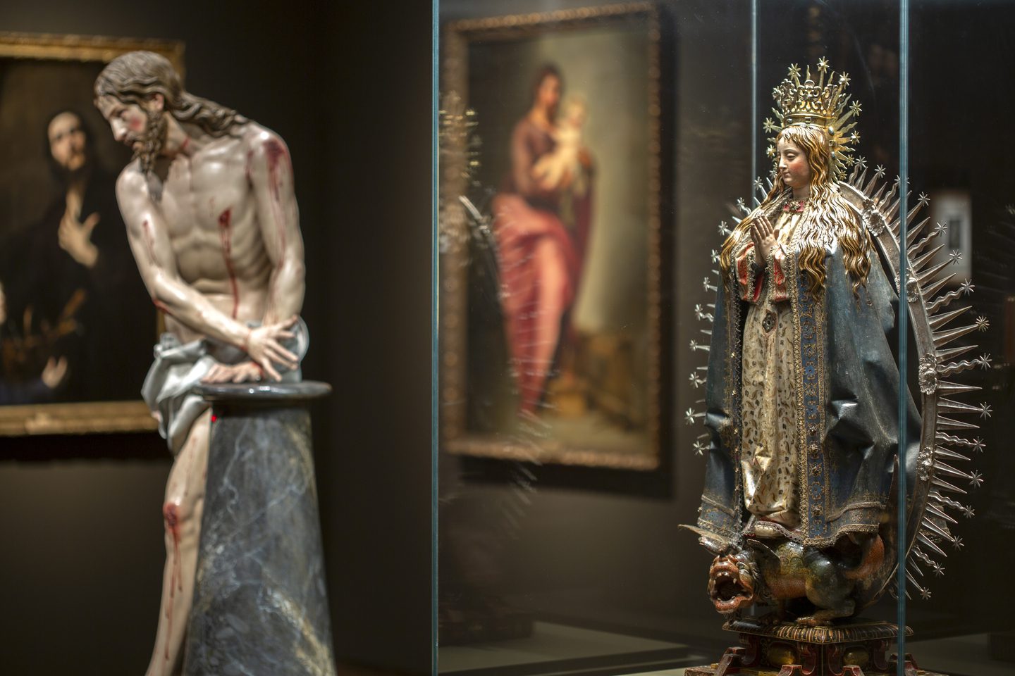 La singularidad que alcanzó en la Edad Moderna la síntesis de volumen y el color en la escultura sólo se explica por el papel que desempeñó como instrumento de persuasión. Esta exposición reflexiona sobre el fenómeno y el éxito de la escultura policromada, que inundó iglesias y conventos en el siglo XVII y que jugó un papel fundamental como apoyo en la predicación. La estrecha y perfecta colaboración entre escultores y pintores nos habla del elevado valor del color, que lejos de ser un mero acabado superficial de la pieza, era una parte esencial de ella sin la cual no se daba por concluida. El color también contribuyó de manera decisiva a acentuar los valores dramáticos de estas creaciones, tanto las destinadas a los retablos como a los pasos procesionales. La gestualidad teatral, unida a la vistosidad de los ropajes, ya fueran esculpidos, de telas encoladas o de textiles reales, convirtieron estos conjuntos en unidades escénicas llenas de significados.