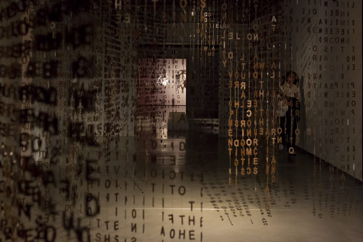 A lo largo de la exposición, el lenguaje y la comunicación también emergen como temas. En Glückauf? (2004), una serie de cortinas de letras recrea la Declaración de los Derechos Humanos de 1948, envolviendo al espectador en un espacio donde el lenguaje se vuelve tangible. Otro ejemplo de su exploración sobre la palabra y el sonido es Il suono del sangue parla la stessa lingua (2004), una proyección de luz y letras de diferentes alfabetos que representa el poder de la conexión humana a través del lenguaje.