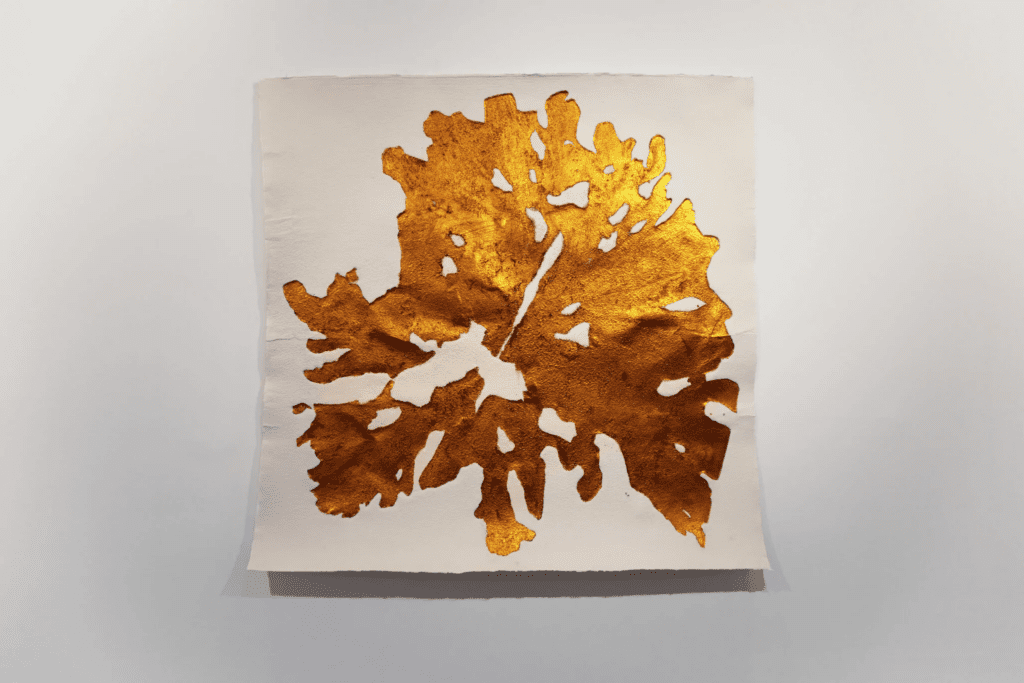 Getsemaní, título de esta exposición, parte del proyecto La Reserva, una serie de grabados realizados a partir de troncos cortados. La prensa imprime la huella del árbol y las obras capturan el vestigio del tiempo atravesado por la violencia de la máquina. En cada impresión sobreviven la cicatriz de la motosierra y el óxido de la placa, y con ellos nace una nueva historia que el árbol comparte.