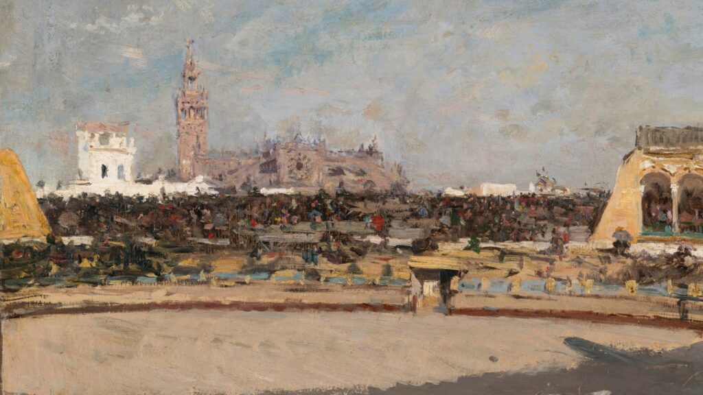 Mariano Fortuny (Reus, Tarragona, 1838-Roma, 1874). «La plaza de toros de Sevilla», c. 1870. Óleo sobre lienzo. 74 x 95 cm. Museo de Bellas Artes de Bilbao. Adquirido gracias al legado de Begoña María Azkue en 2024.