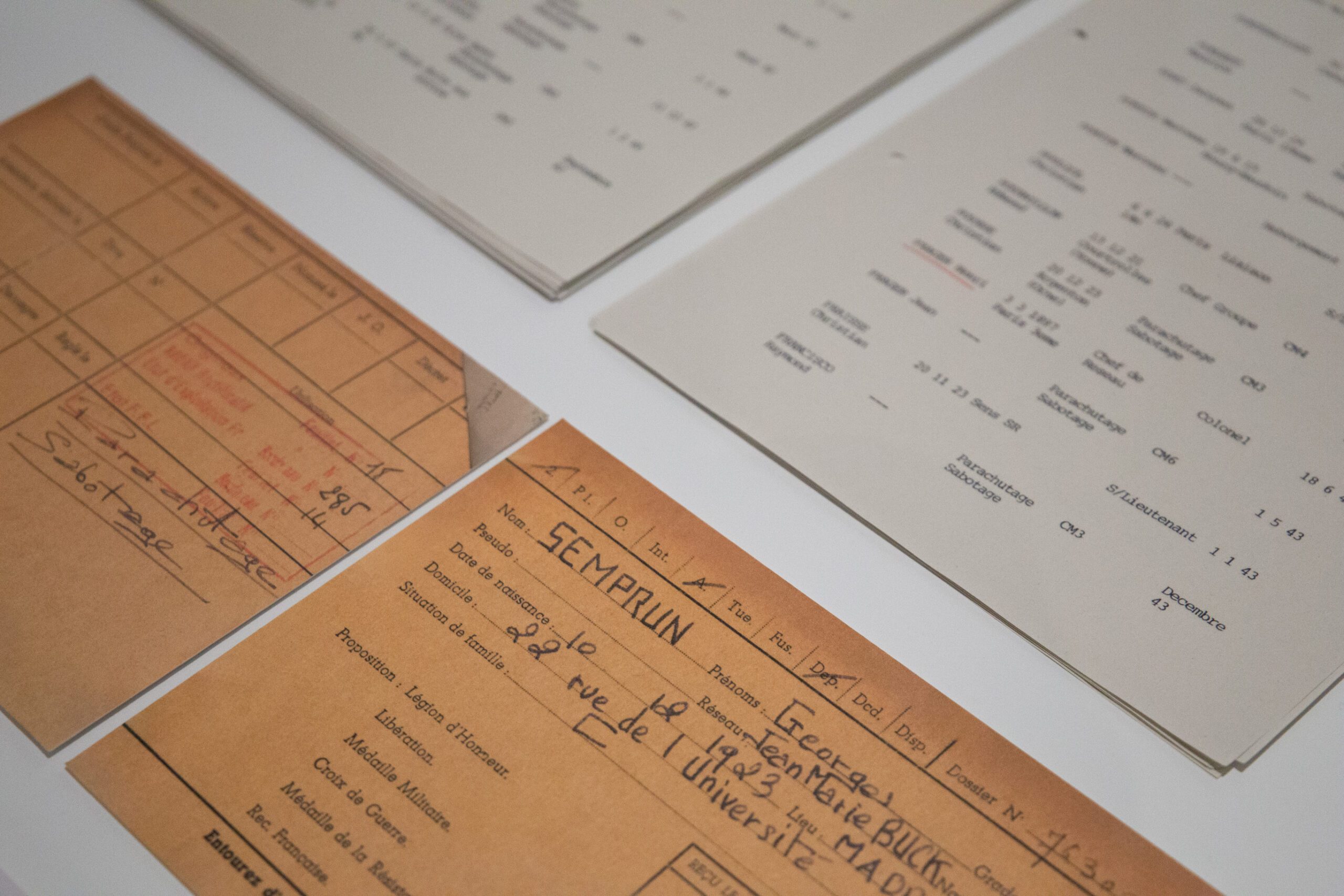 1936-1945. Exilio, resistencia y deportación. Documenta aquella terrible experiencia y su condición de exiliado, resistente, deportado y superviviente. Entre 1936 y 1945, Semprún conoció la peor versión del ser humano, pero también forjó su compromiso intelectual y político. De esta etapa se exponen su tarjeta de refugiado, prestada por la Office Français de Protection des Réfugiés et Apatrides (OFPRA), y la documentación que le acredita como miembro de la Resistencia.