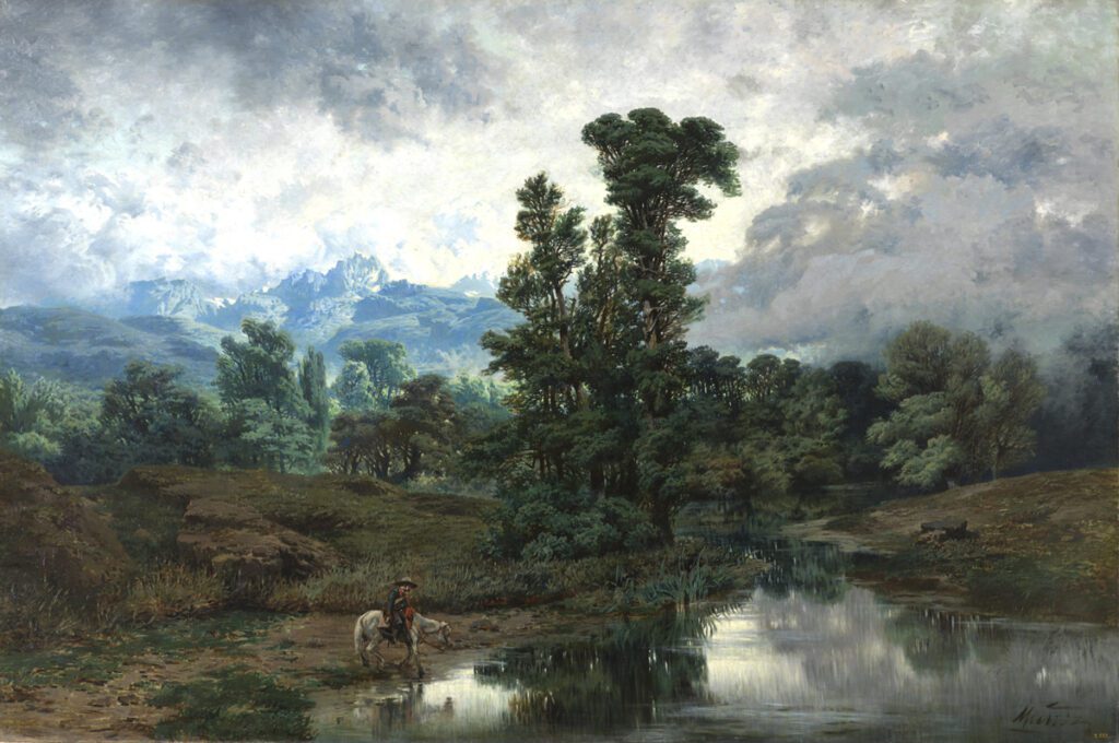 ‘Paisaje del Pardo al disiparse la niebla’. Muñoz Degrain, Antonio 1866. Óleo sobre lienzo, 200 x 300 cm. Madrid, Museo Nacional del Prado. Adquirido en 1867.