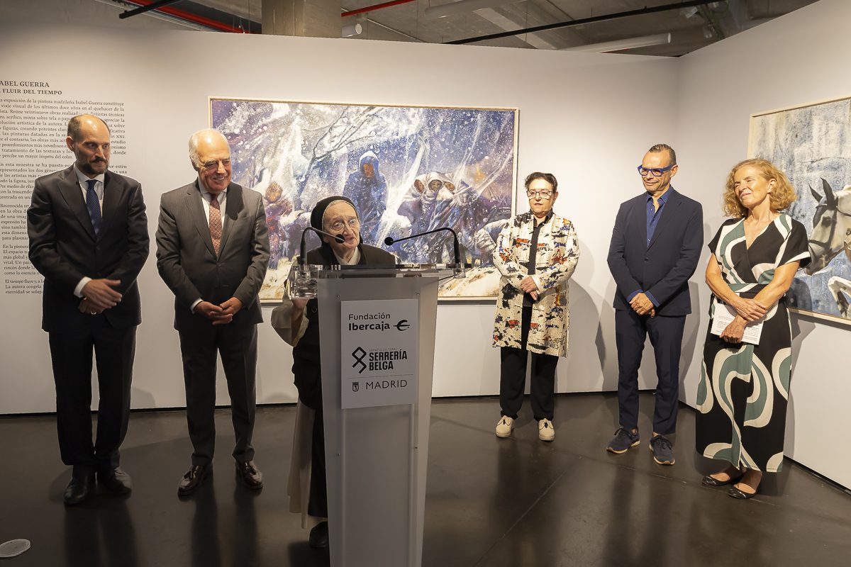 La muestra une dos elementos muy presentes en la obra de Guerra en su última etapa. Por una parte, el clasicismo en su manera de abordar la pintura y, por otra, la modernidad, visible en el tratamiento de texturas, la incorporación de fondos abstractos y el uso prominente del color. En El fluir del tiempo son protagonistas los dos géneros que más ha cultivado, como son la figura y el paisaje.
