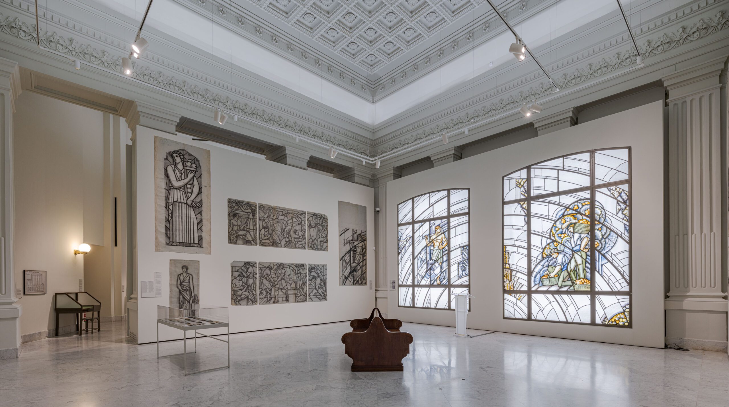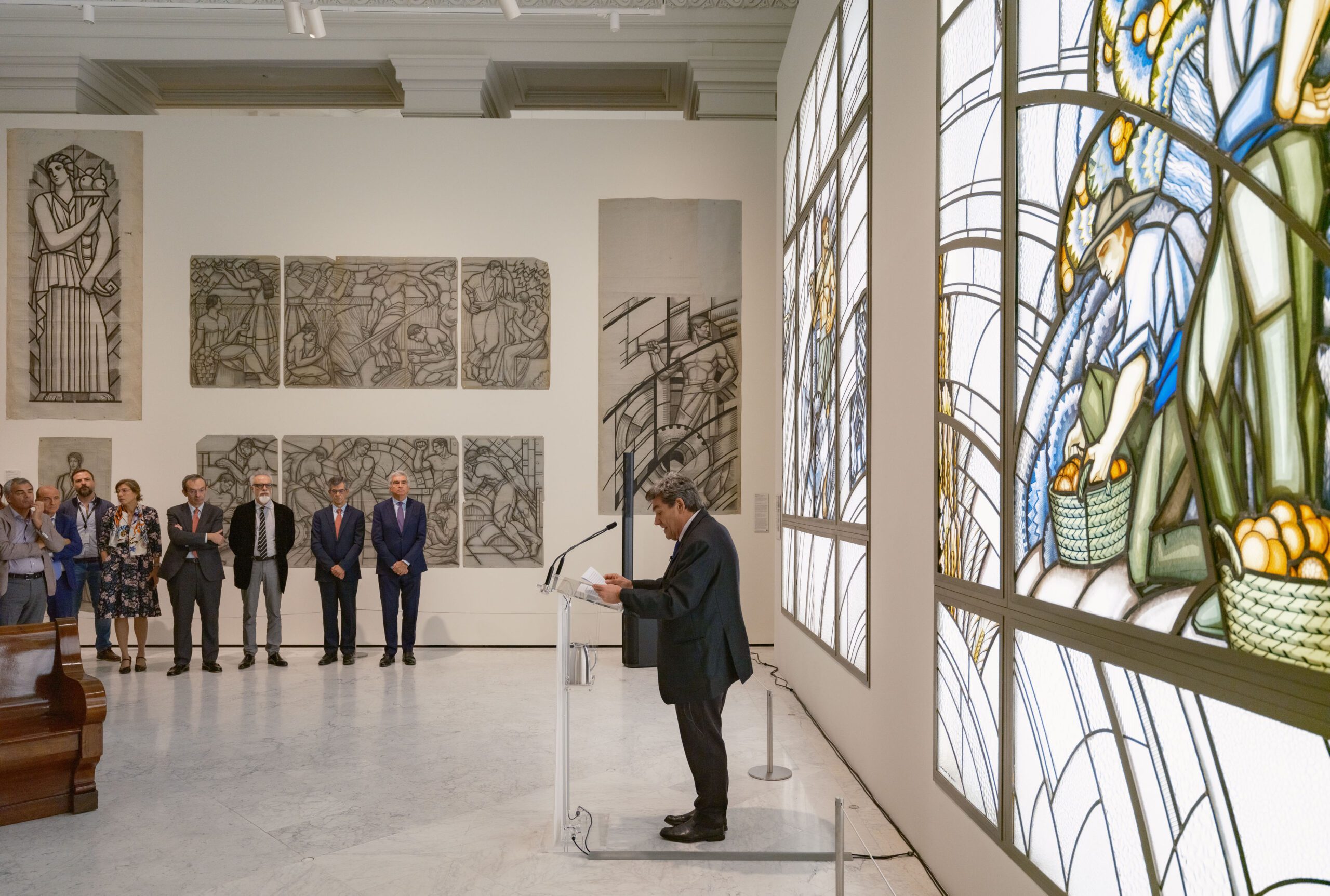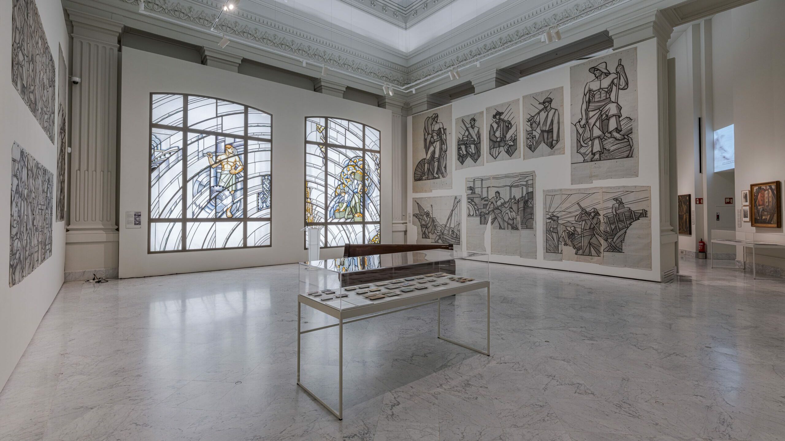 El primer espacio retrata la España de los treinta a través de obras de Sorolla, Gutiérrez Solana, Casas, Torres García o Arissa, que ayudan a contextualizar la iconografía de las vidrieras. El segundo se adentra en el taller de Maumejean Hermanos, revelando los procesos artesanales y la compleja construcción del conjunto decorativo. El núcleo de la muestra reúne los monumentales cartones del Patio de Operaciones y los vitrales restaurados de Agricultura e Industria, atribuidos a Albert Martorell.