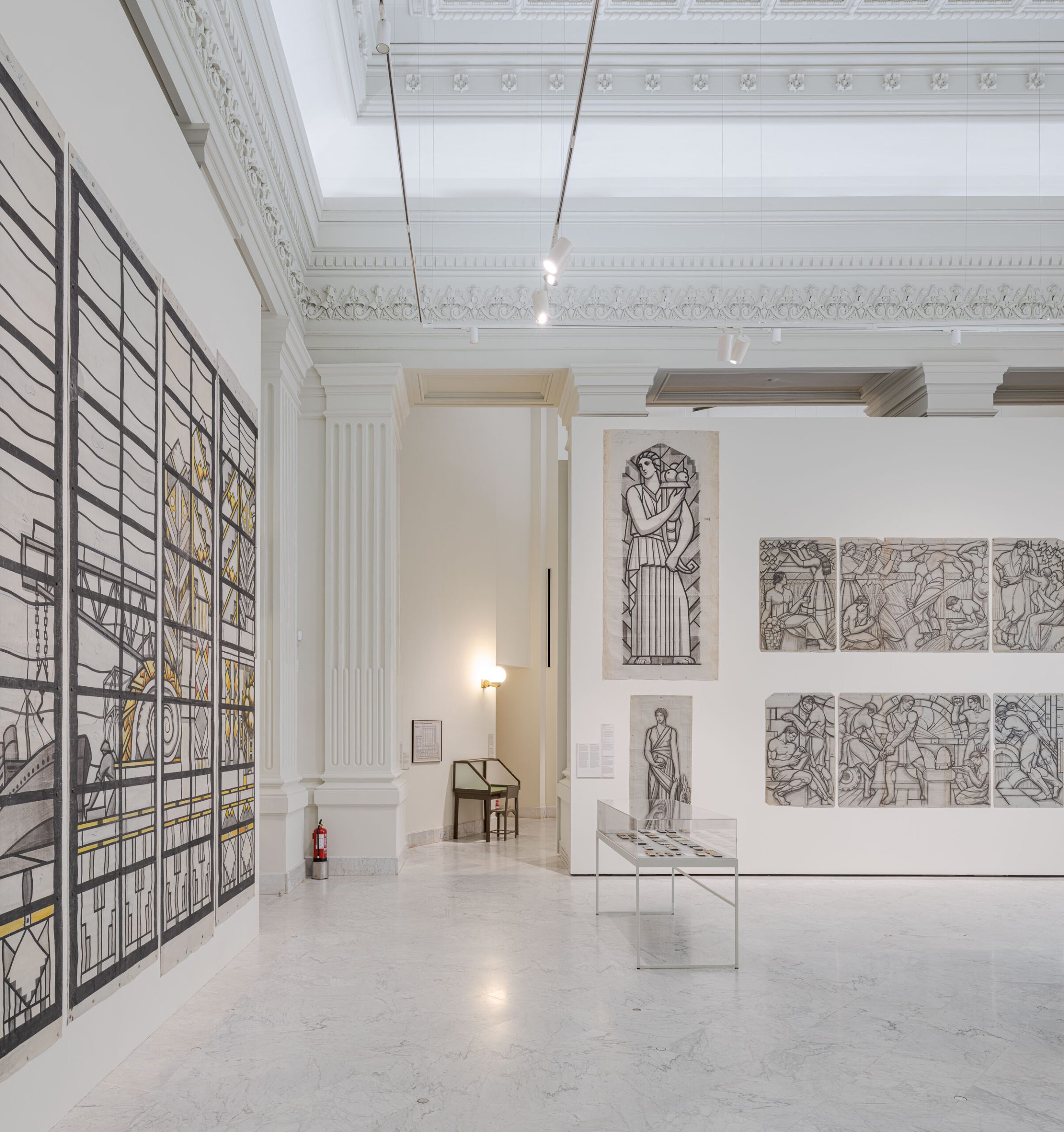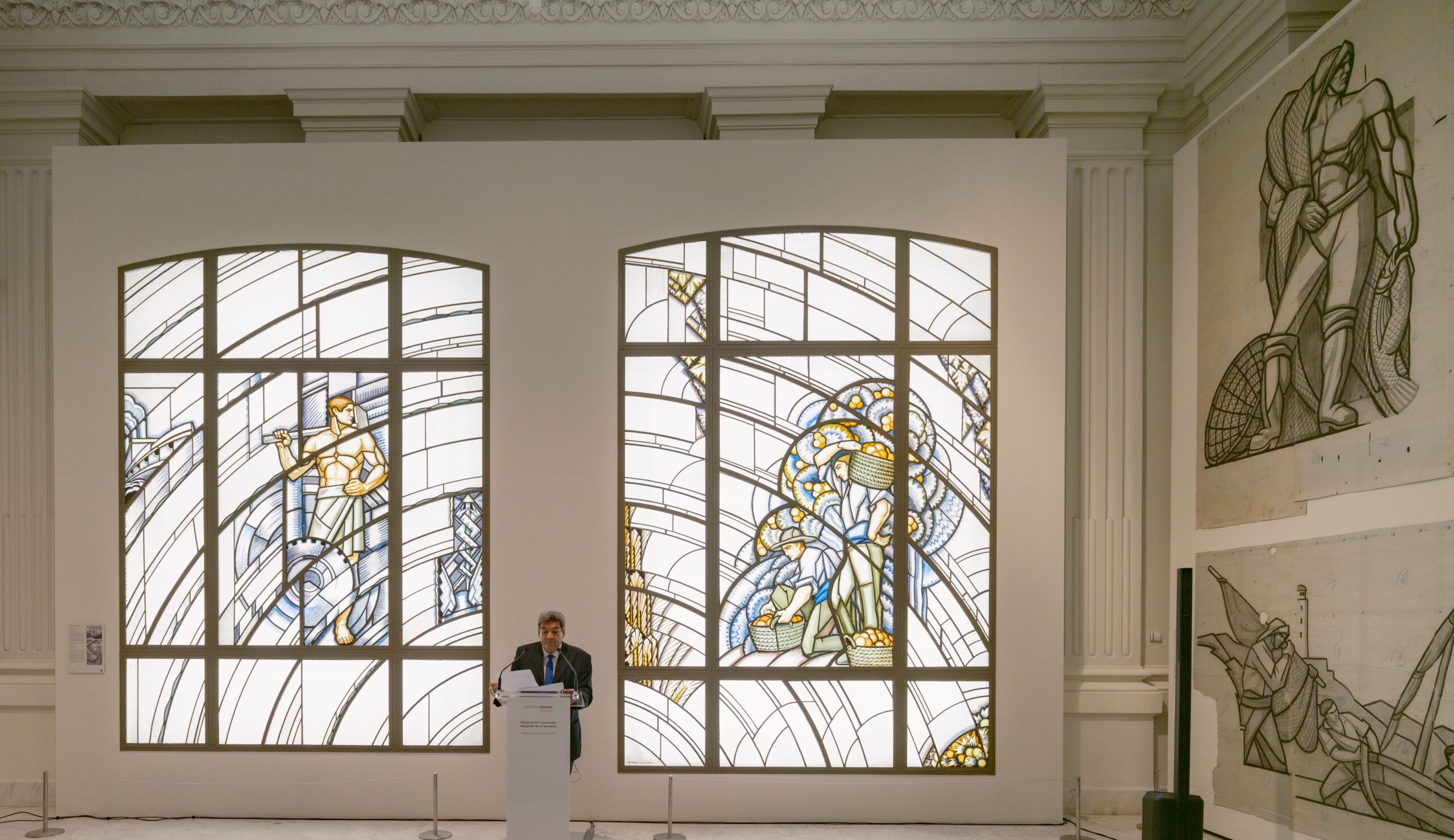 Uno de los logros de la exposición es la recuperación y estudio de los cartones originales de Maumejean, conservados en el Archivo de La Granja. Su restauración no solo devuelve protagonismo a un conjunto excepcional del art déco institucional europeo, sino que permite entender la ampliación de Yárnoz Larrosa como un proyecto integral en el que arquitectura y artes aplicadas actuaban al unísono.