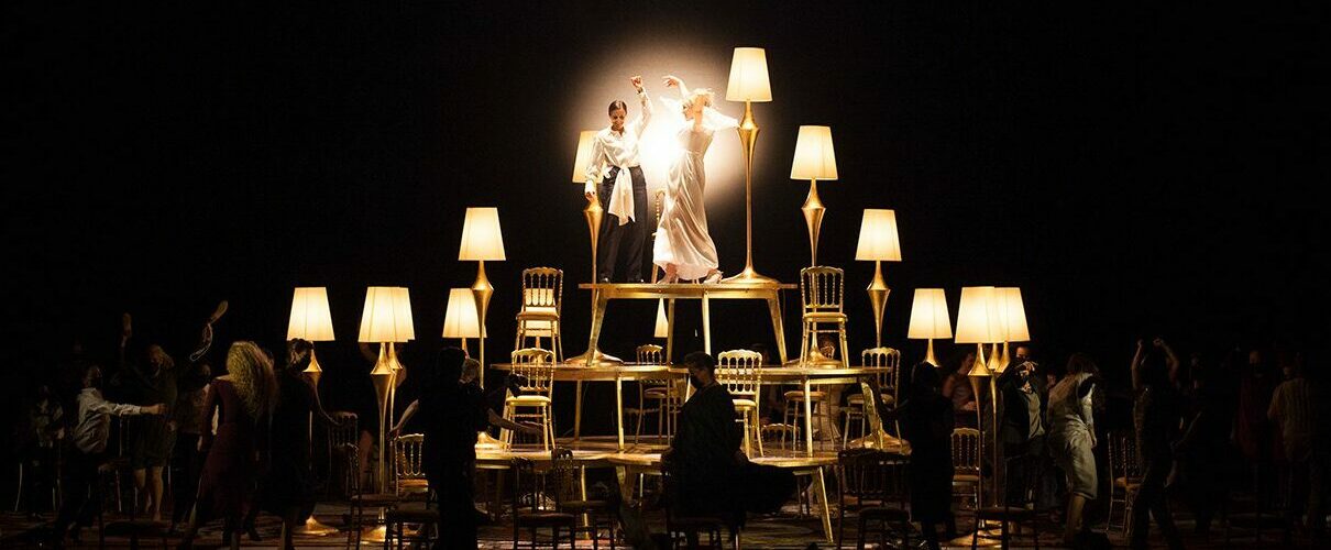 En la puesta en escena de Alex Ollé (La Fura dels Baus), que ya dirigió en el Teatro Real Ascenso y caída de la ciudad de Mahagonny (2010), El holandés errante (2016), Faust (2018) y Juana de Arco en la hoguera (2022), se sobreponen dos planos: uno real ­toda la ópera se desarrolla durante la boda de Ariadna y Barbazul­ y otro simbólico, que representa el subconsciente de Ariadna, inspirado en La interpretación de los sueños, de Sigmund Freud, en boga en la época.