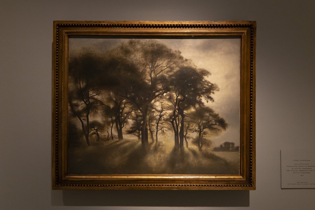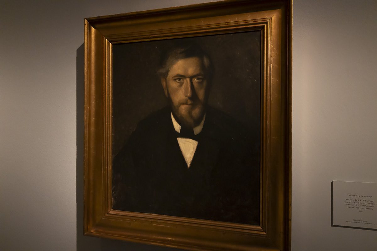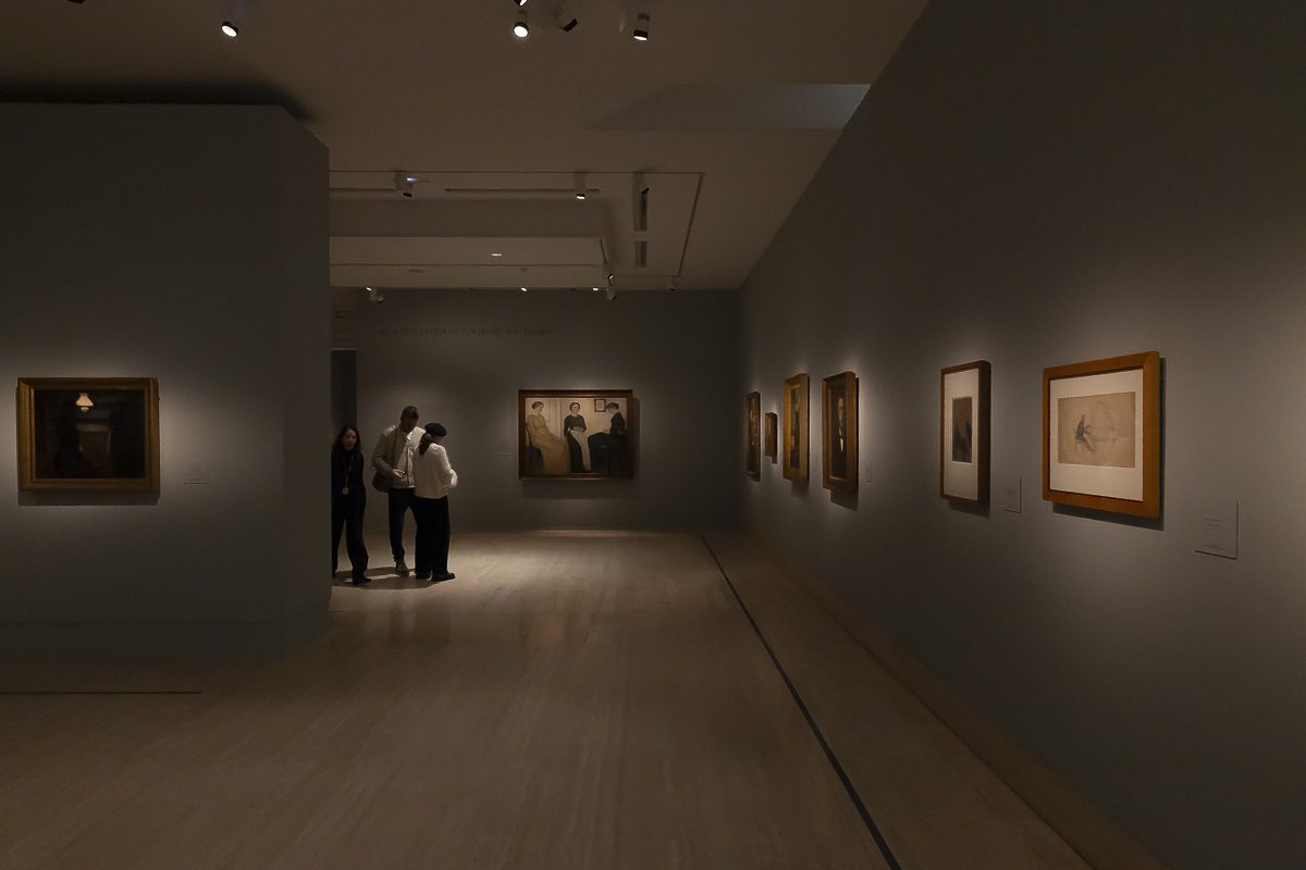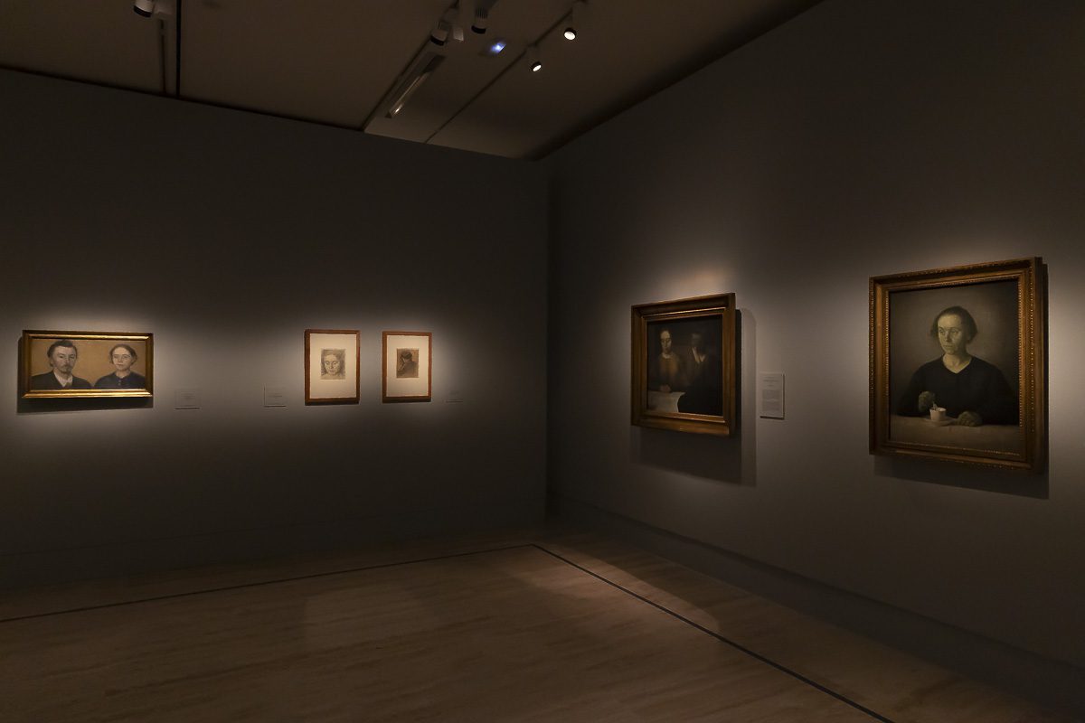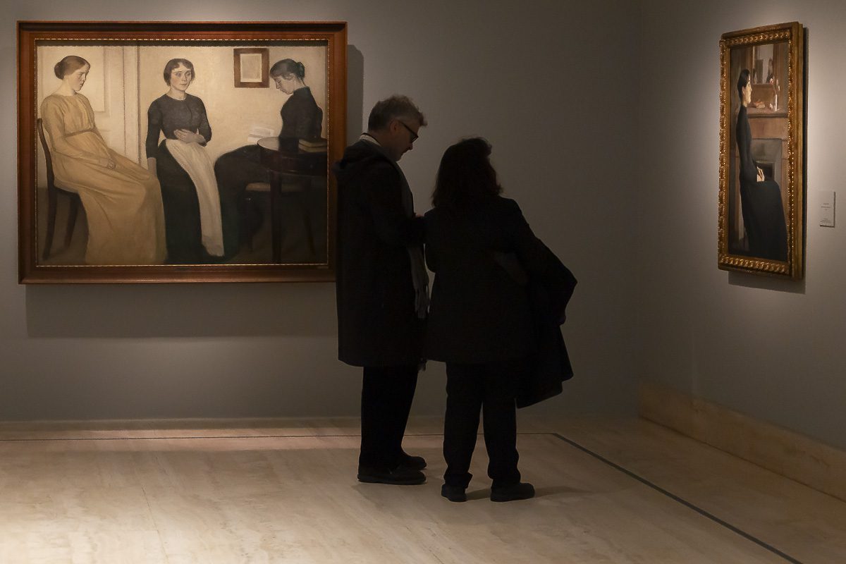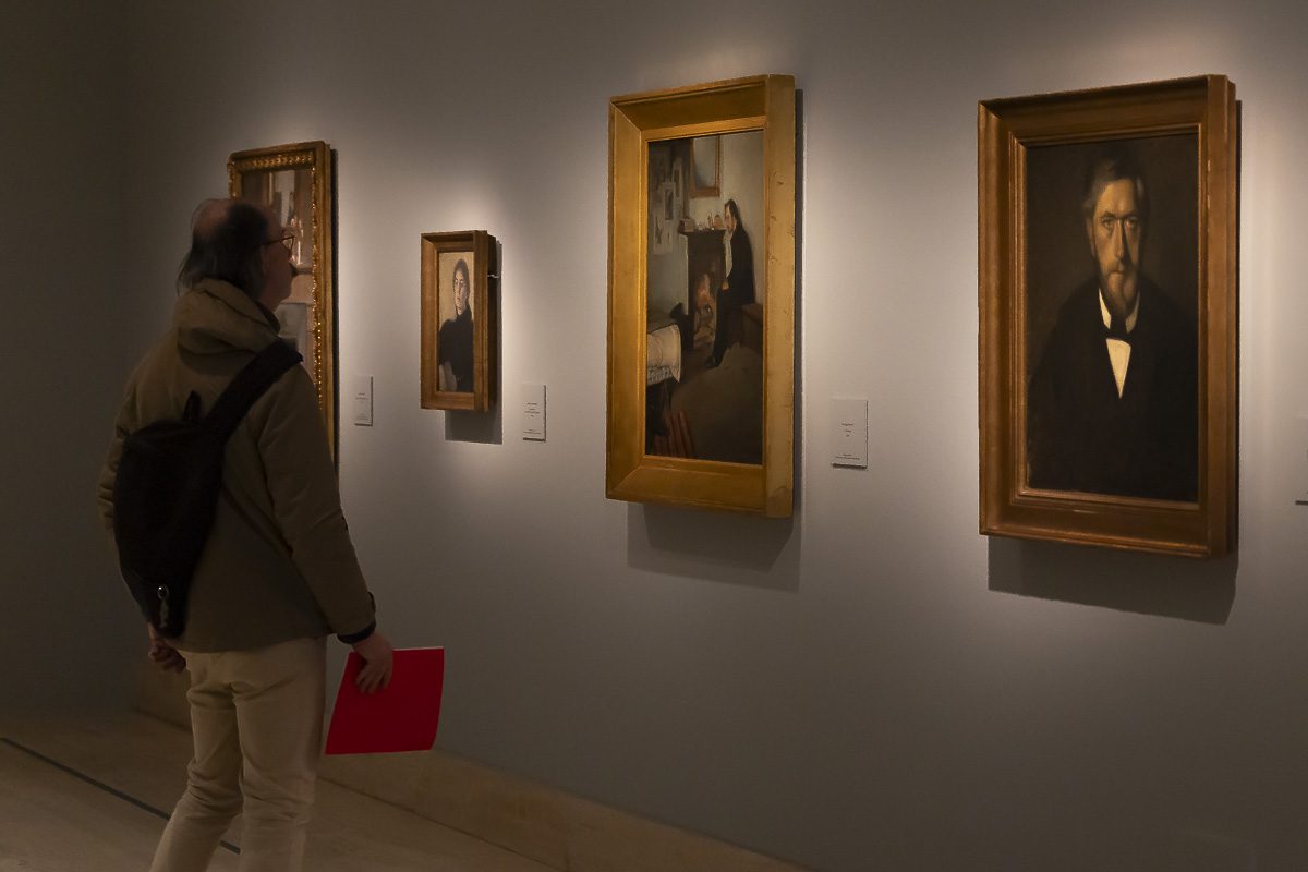 La muestra, comisariada por Clara Marcellán, revisa la producción de un creador que encontró muy pronto su camino estético. Tras su formación académica y su paso por las Frie Studieskoler, en la década de 1880 ya perfilaba los rasgos que no abandonaría. Tonos apagados, figuras ensimismadas y espacios austeros definen obras tempranas como el Retrato de Ida Ilsted (1890) o Tarde en el salón. La madre y la mujer del artista (1891), donde el recogimiento domina la escena.