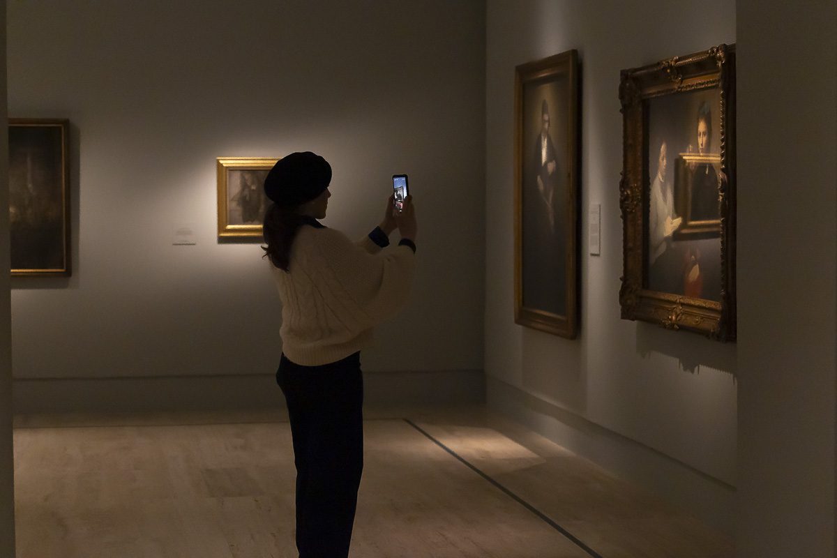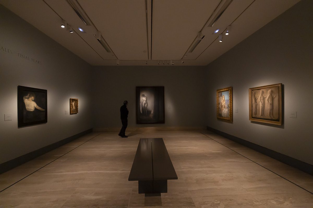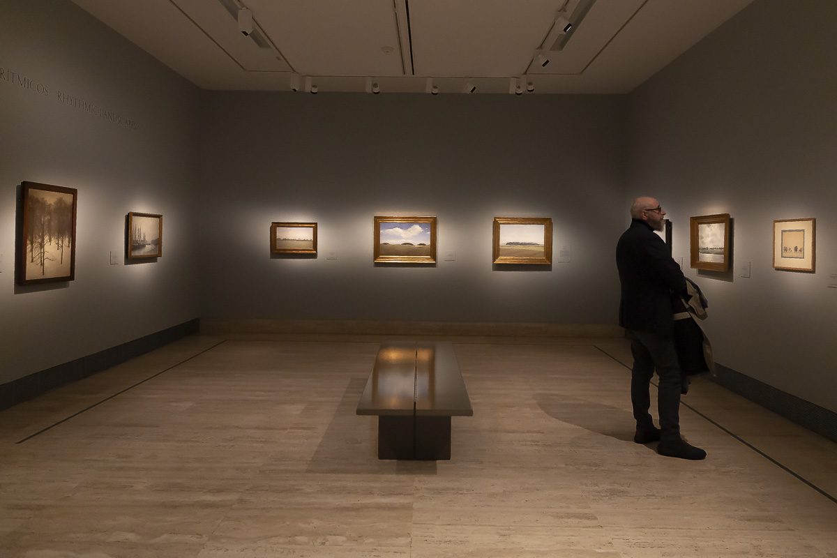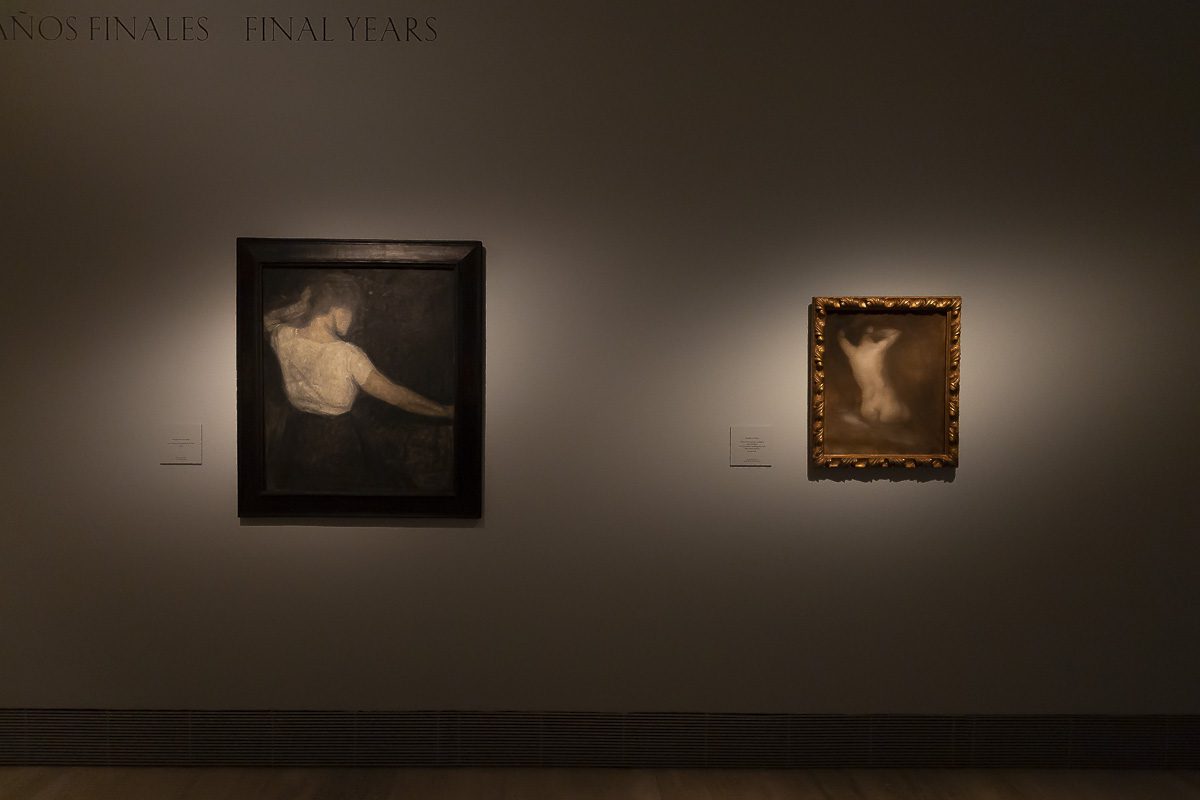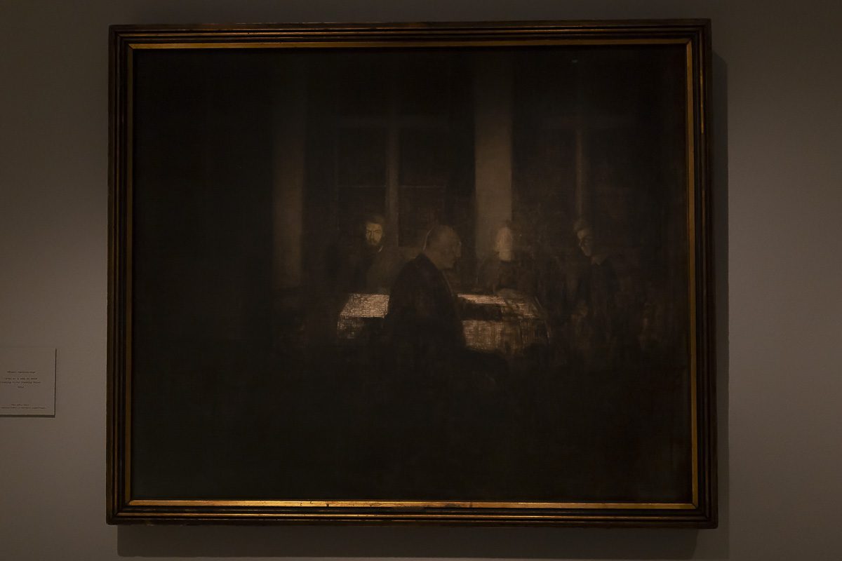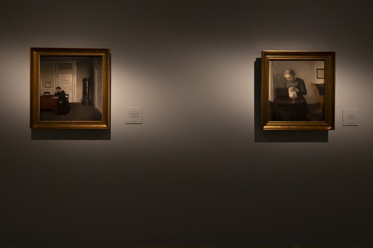 La muestra, comisariada por Clara Marcellán, revisa la producción de un creador que encontró muy pronto su camino estético. Tras su formación académica y su paso por las Frie Studieskoler, en la década de 1880 ya perfilaba los rasgos que no abandonaría. Tonos apagados, figuras ensimismadas y espacios austeros definen obras tempranas como el Retrato de Ida Ilsted (1890) o Tarde en el salón. La madre y la mujer del artista (1891), donde el recogimiento domina la escena.