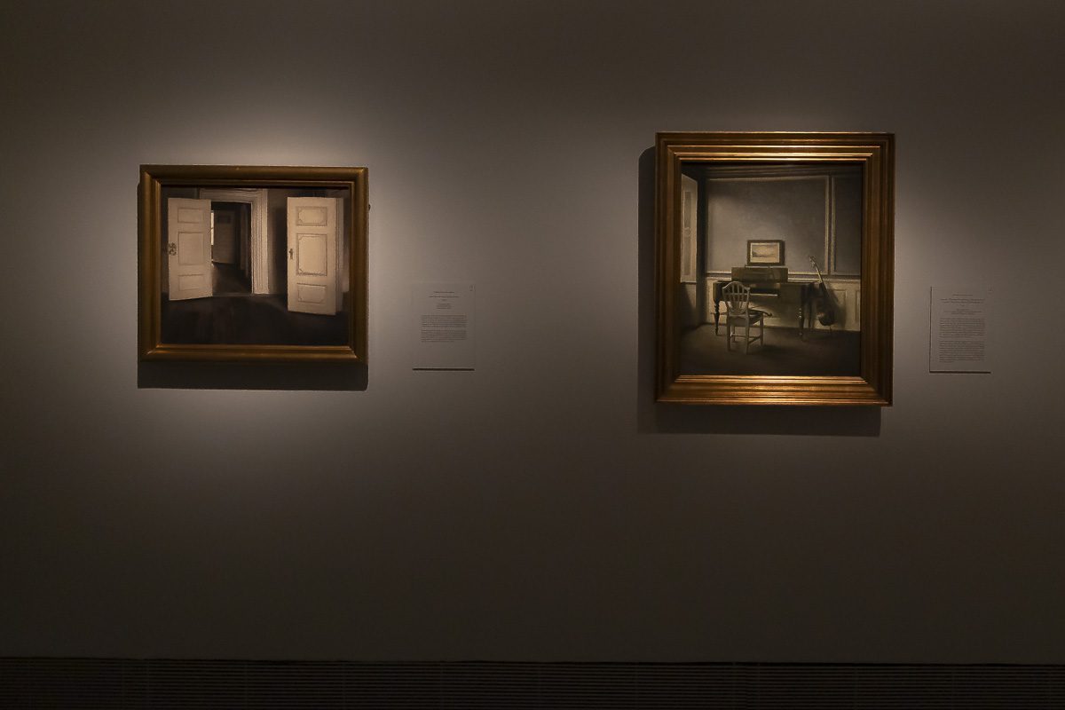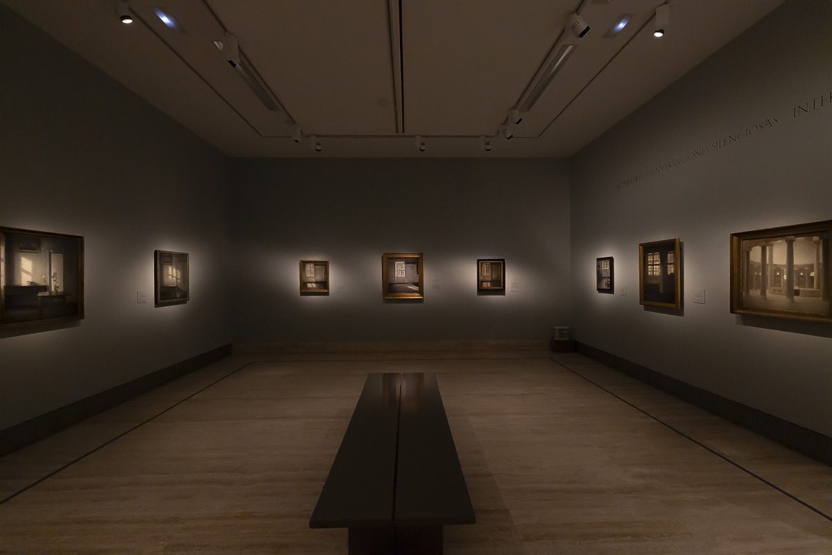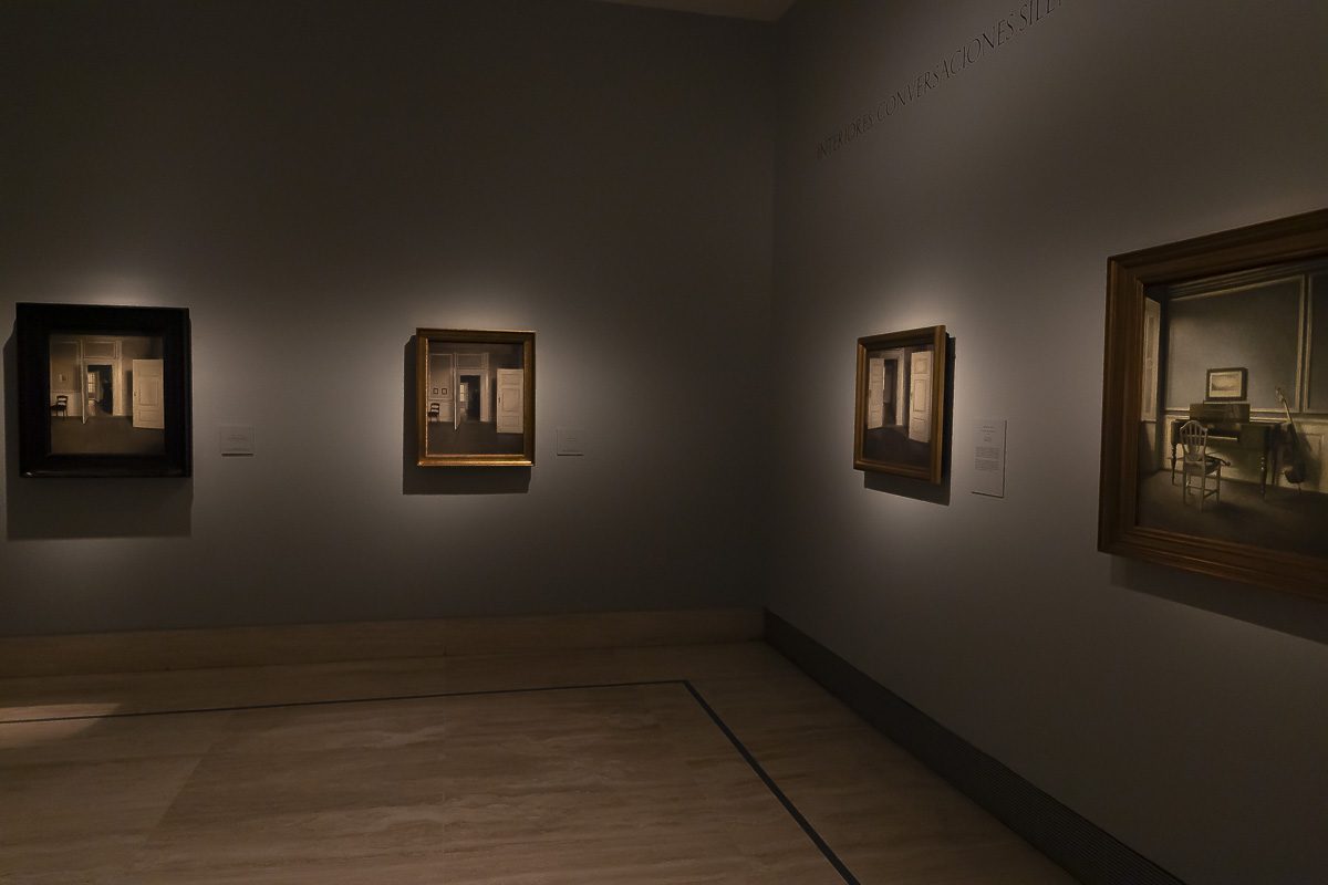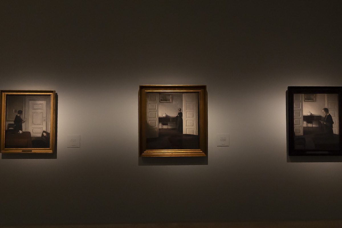 El núcleo más célebre de su producción lo forman los interiores. Entre 1898 y 1909, instalado en el número 30 de Strandgade en Copenhague, realizó más de sesenta pinturas de aquellas habitaciones desnudas. Algunas incluyen figuras femeninas, casi siempre de espaldas. Otras prescinden de cualquier presencia humana. Puertas entreabiertas, suelos desnudos y ventanas tamizadas por una luz oblicua construyen un espacio donde la atmósfera es protagonista. En Rayos de sol o luz del sol. Motas de polvo bailando en los rayos de sol. Strandgade 30 (1900), la claridad que atraviesa la estancia convierte el polvo en un acontecimiento.