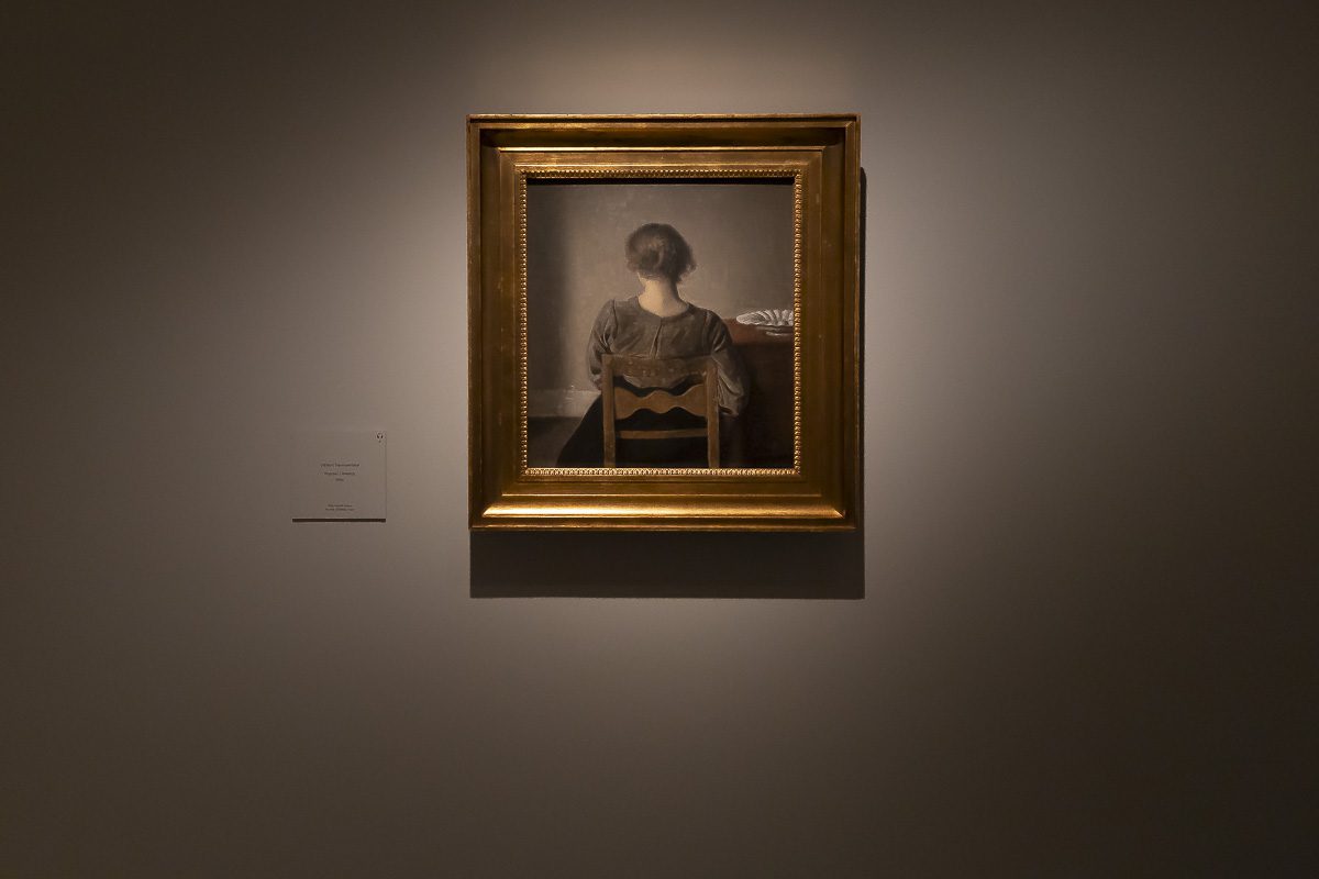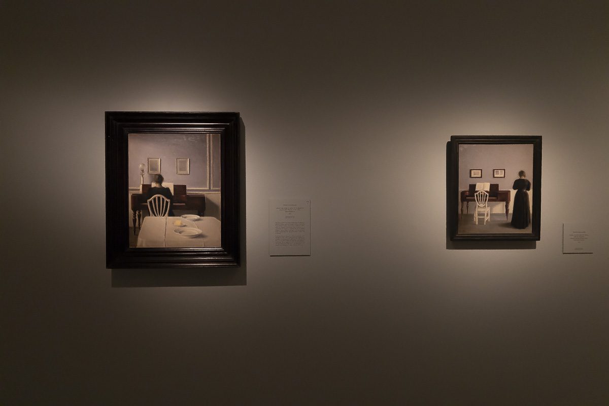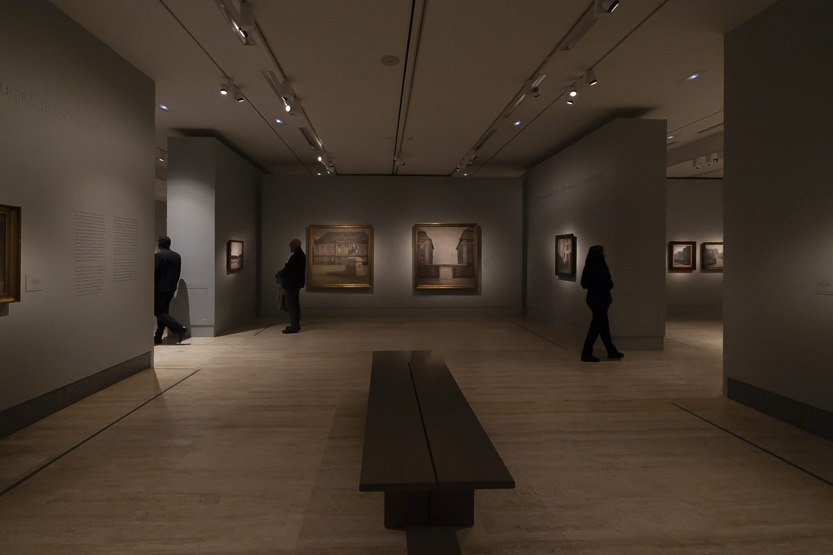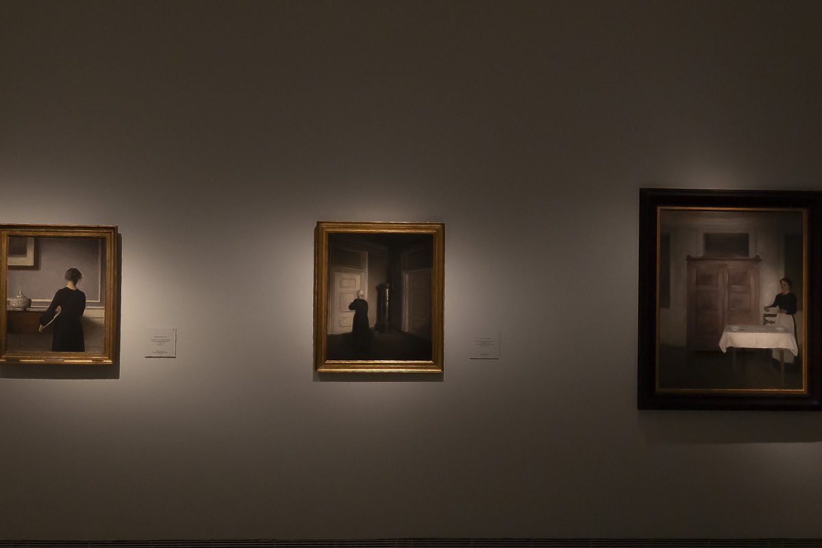 El núcleo más célebre de su producción lo forman los interiores. Entre 1898 y 1909, instalado en el número 30 de Strandgade en Copenhague, realizó más de sesenta pinturas de aquellas habitaciones desnudas. Algunas incluyen figuras femeninas, casi siempre de espaldas. Otras prescinden de cualquier presencia humana. Puertas entreabiertas, suelos desnudos y ventanas tamizadas por una luz oblicua construyen un espacio donde la atmósfera es protagonista. En Rayos de sol o luz del sol. Motas de polvo bailando en los rayos de sol. Strandgade 30 (1900), la claridad que atraviesa la estancia convierte el polvo en un acontecimiento.