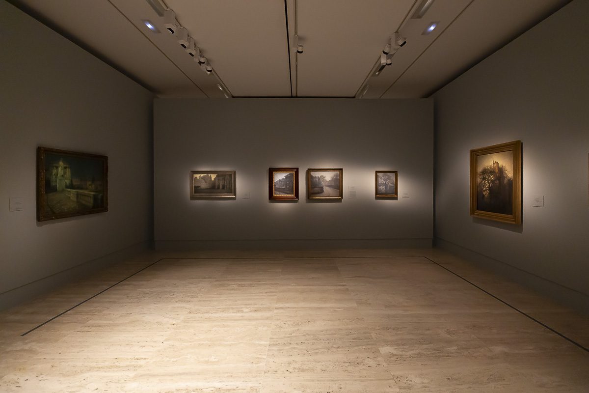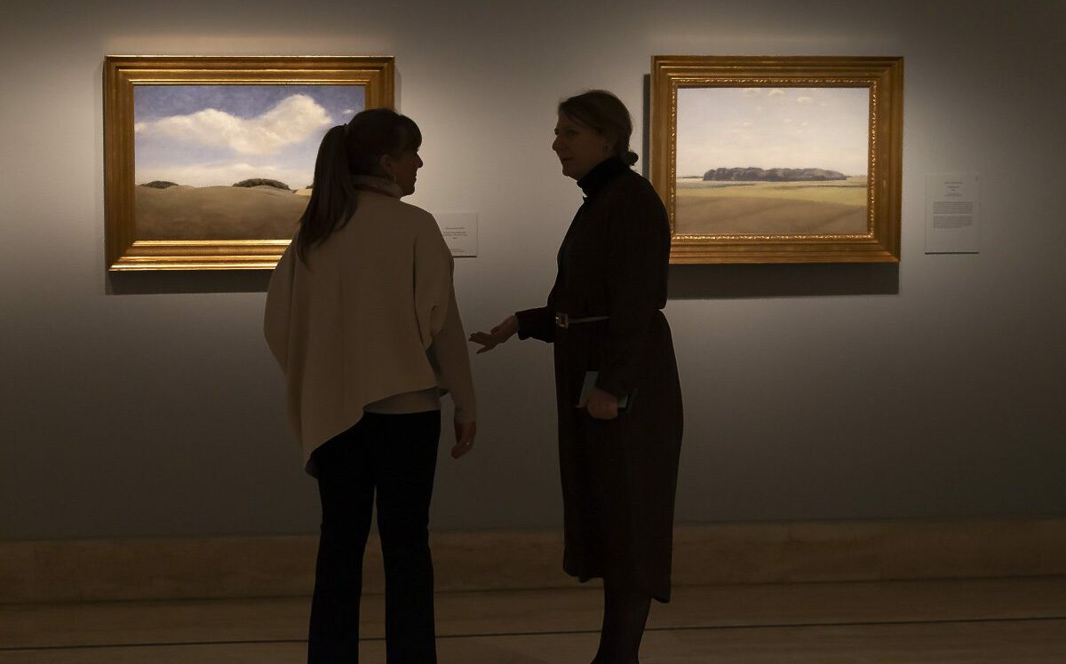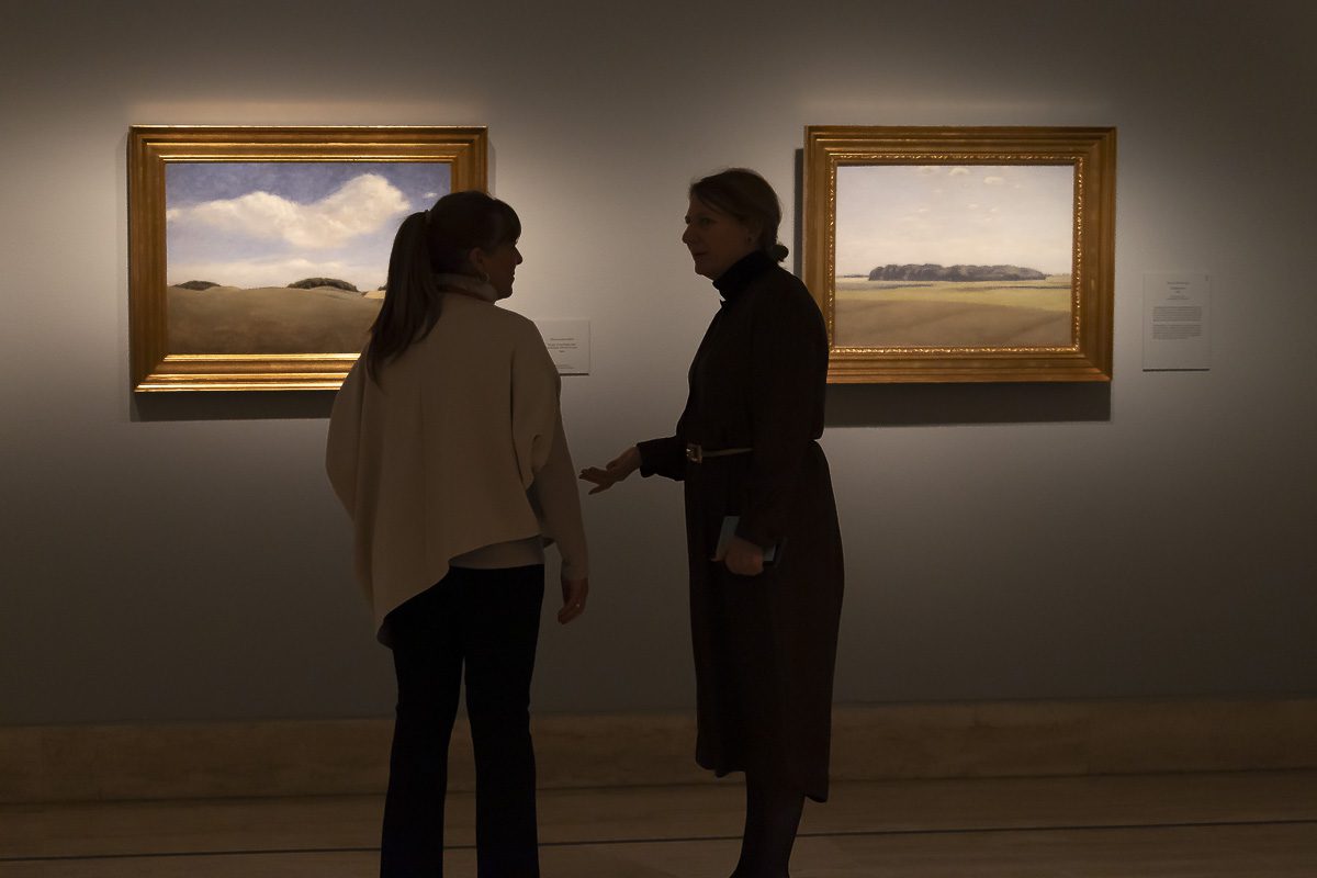 Fuera del ámbito doméstico, la ciudad aparece vacía. En Plaza de Amalienborg, Copenhague (1896) o en las vistas de los edificios históricos de la ciudad, la arquitectura se impone con una serenidad casi irreal. El punto de vista elevado y la ausencia de transeúntes intensifican esa sensación de suspensión. Los paisajes rurales, pintados durante sus estancias veraniegas, comparten la misma sobriedad. Caminos, árboles y granjas se disponen en planos superpuestos bajo una luz uniforme que diluye cualquier dramatismo.