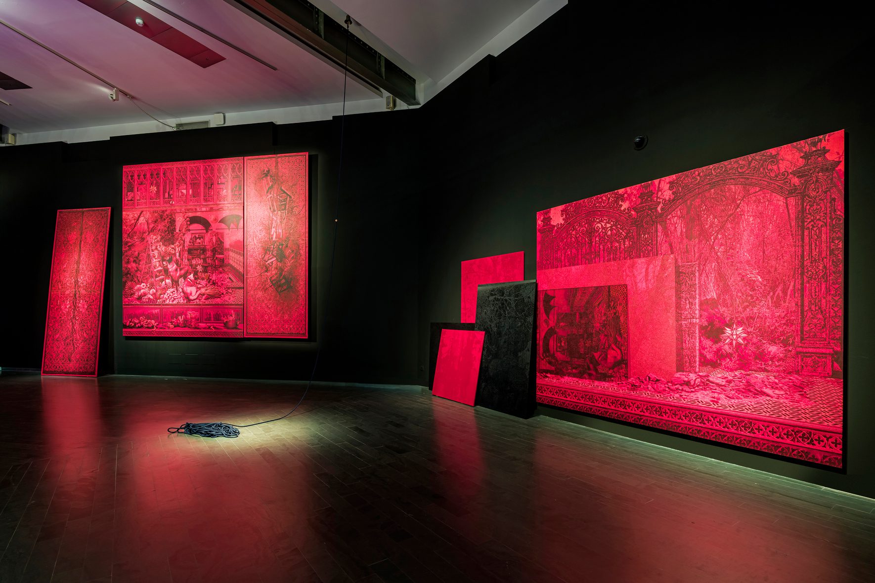 En sus grandes sedas y en los delicados dibujos sobre papel japonés conviven ecos de Fra Angelico o Manet con escenas vinculadas a su entorno cotidiano, a su taller y a su biografía afectiva. Naturalezas abandonadas, arquitecturas en ruina o en tránsito, espacios que parecen suspendidos en un instante previo a la desaparición. Cada obra acumula signos y referencias metalingüísticas, pero también afectos y energía emocional. Como explica la comisaria: «Son obras que de forma poética abordan cuestiones urgentes como la crisis ecológica, la desigualdad, la precariedad global y la urgencia de recuperar valores éticos y espirituales y que reclaman reflexión, silencio e introspección al visitante. A recuperar la inocencia perdida».