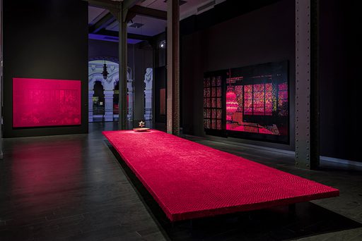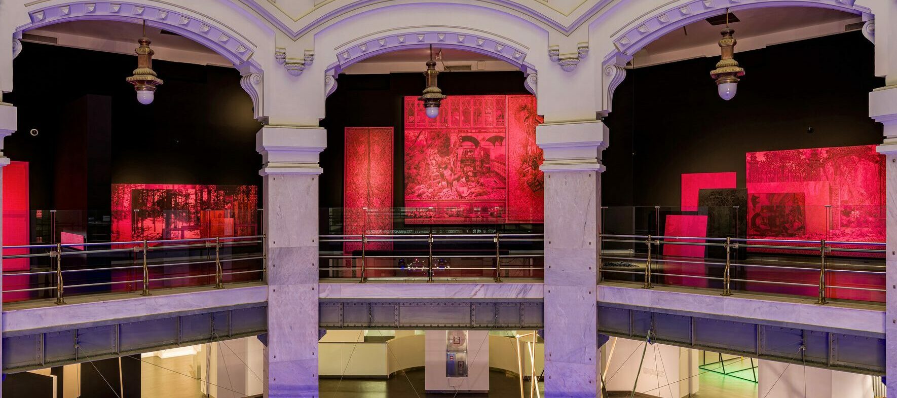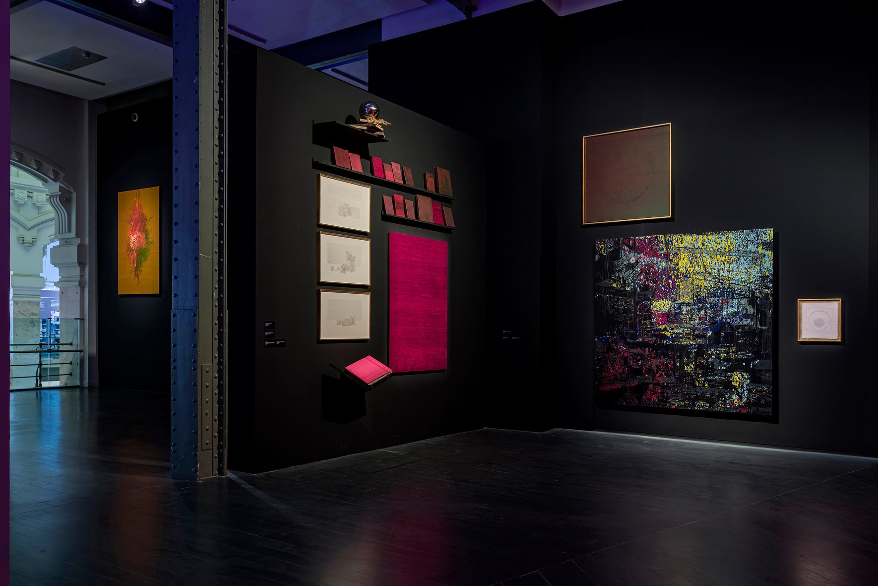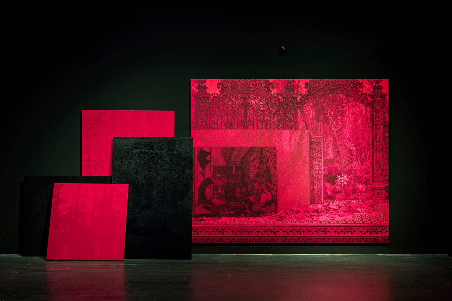 La muestra, comisariada por Isabel Tejeda, ocupa la planta cuarta del Palacio de Cibeles y establece un diálogo directo con su espectacular arquitectura. Más de medio centenar de obras conforman esta gran instalación pictórica, cerca de veinte concebidas específicamente para la ocasión. No se trata de una simple reunión de piezas, sino de una intervención que transforma el espacio en un ámbito de recogimiento. En el núcleo del recorrido, una obra que recuerda la estructura de un retablo —recurso habitual en la trayectoria del artista— se alza en sintonía con la monumentalidad del edificio, sugiriendo la presencia de un ábside contemporáneo donde la pintura reclama silencio.