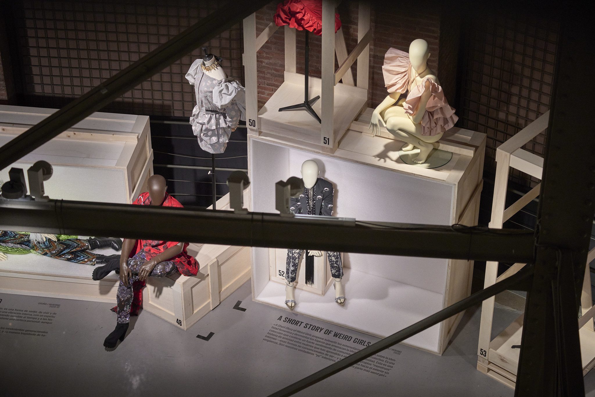 Uno de los aspectos más singulares del proyecto reside en su diseño expositivo. La escenografía se articula mediante cajas de transporte de madera que evocan un tiempo suspendido. Dentro de ellas, los maniquíes parecen esperar, como si el montaje se hubiese detenido en el instante previo a revelarse. Esa sensación de pausa introduce una dimensión casi teatral y subraya la idea de la moda como archivo en movimiento.