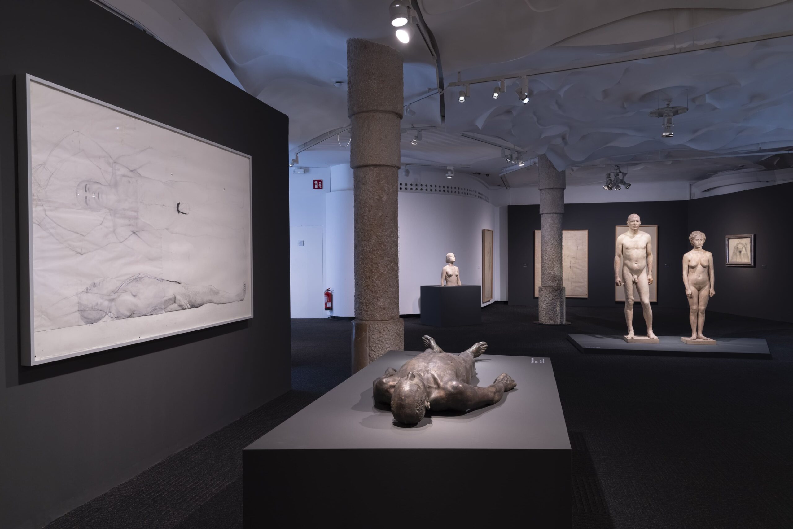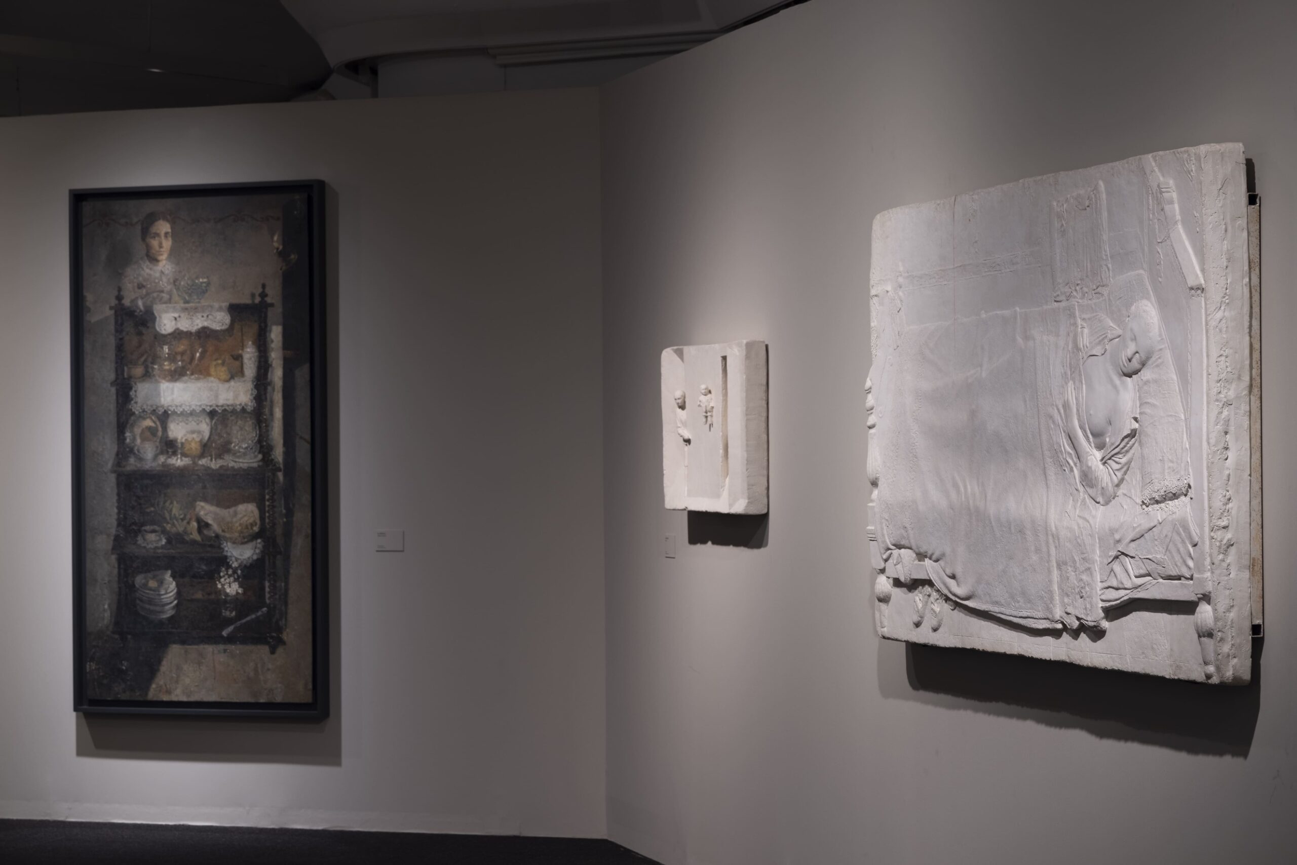 Durante los años cincuenta, Antonio López explora distintos lenguajes en busca del suyo propio y recurre a elementos simbólicos y surrealistas para reforzar el componente narrativo de sus obras, pero siempre desde la figuración. Se inicia pintando retratos, como Cuatro mujeres (1957) –presente en esta exposición–, y bodegones como Cabeza griega y vestido azul (1958). A finales de la década comienza a realizar relieves e incorpora a sus creaciones la escultura, una disciplina que nunca ha abandonado.