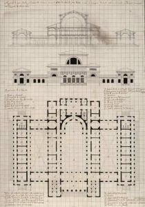 Bolsa y Tribunal de Comercio para Madrid. Borradores de planta, alzado y sección, 1834.