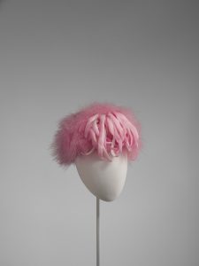 Casquete, 1964-1965 Plumas de marabú sobre estructura en esparterina, con adorno frontal imitando pétalos de crisantemo Etiqueta «BALENCIAGA», París Donación Silvia de Cuevas, 2000. CBM 2000.219