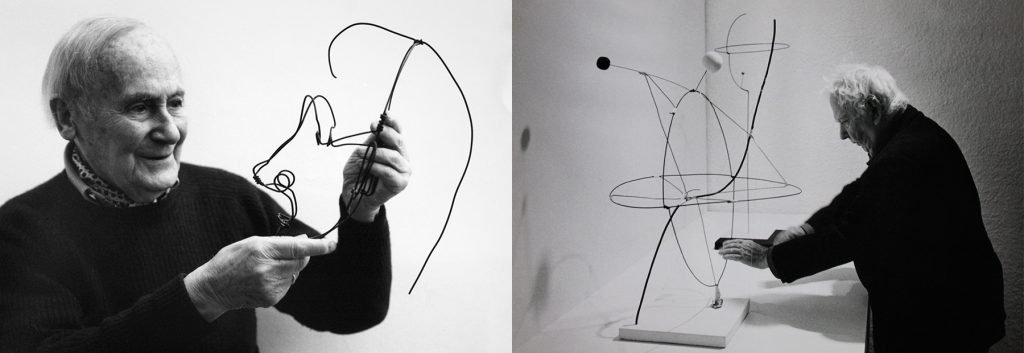Joan Miró (1893 – 1983) exploró la faceta más imaginativa del subconsciente a través de formas orgánicas retorcidas, dibujos espontáneos, signos caligráficos, composiciones geométricas y colores primarios. Las artes plásticas fueron su vehículo para transmitir un espíritu rebelde frente a los acontecimientos políticos y sociales de la época. Por otra parte, el ingeniero mecánico Alexander Calder (1898 – 1976) comenzó con figuras de animales en madera y alambre, progresivamente simplificadas hasta la abstracción e, incluso, articuladas para ganar dinamismo. De esta manera surgieron sus famosos móviles, «chupin» o juguetes móviles colgantes, que darían el pistoletazo de salida para la escultura cinética. Pero… ¿cómo se conocieron?