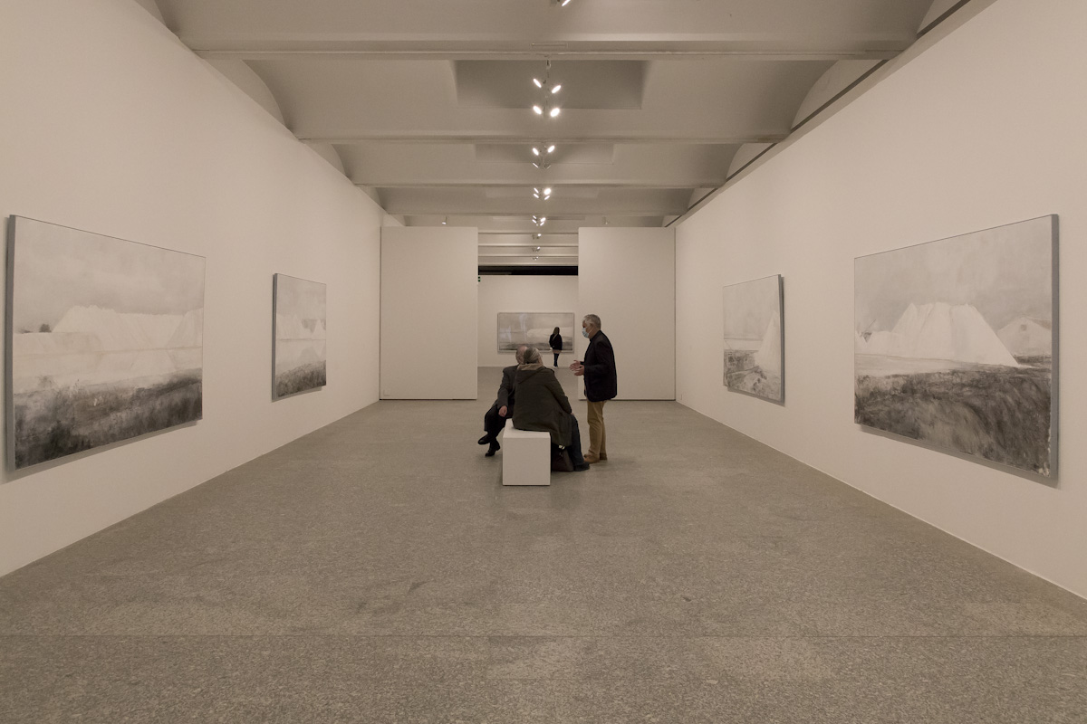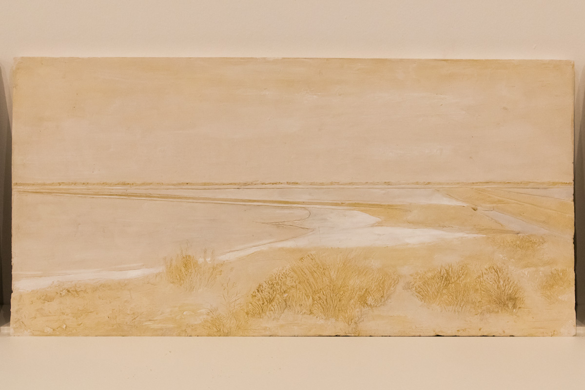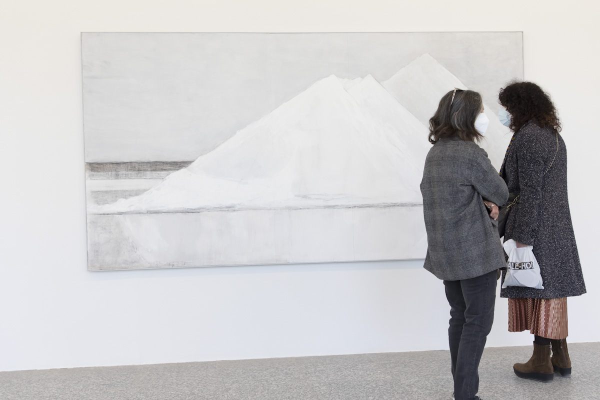 Las montañas de sal tienen una presencia rotunda pero no eluden cierto aspecto evanescente, casi espectral. Y además de las salinas, otro grupo de pinturas radicalmente diferente en su tratamiento del color, obras que comparten la misma intensidad lumínica y una composición articulada en torno a una férrea línea del horizonte. La muestra presenta también un importante conjunto de bajorrelieves en torno al mismo motivo, realizados en fechas recientes, que revelan de nuevo un interés por la línea del horizonte.
