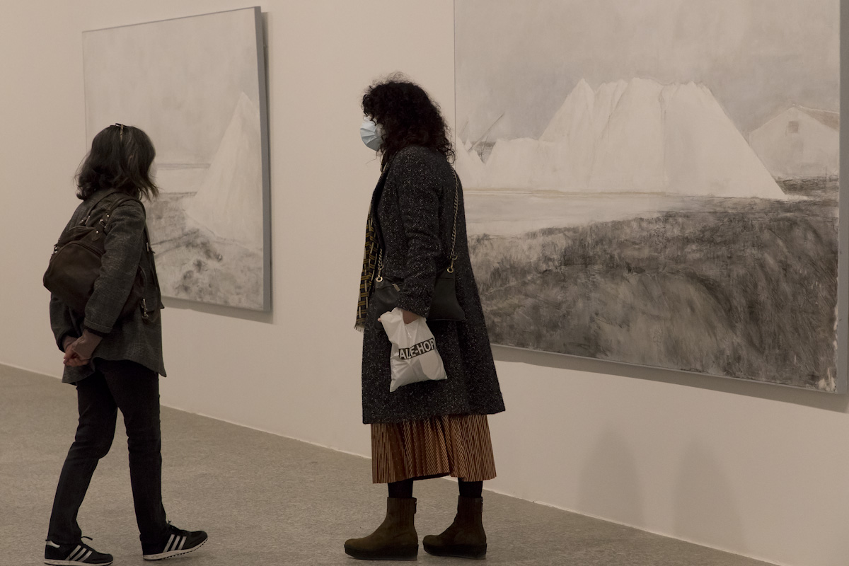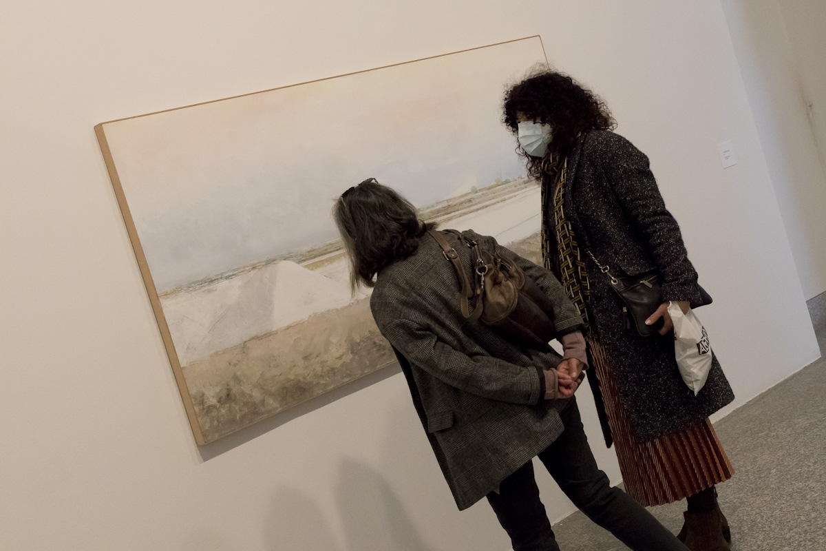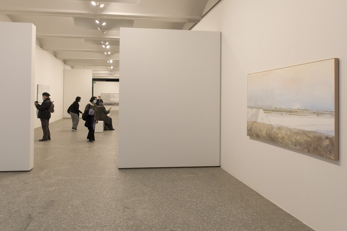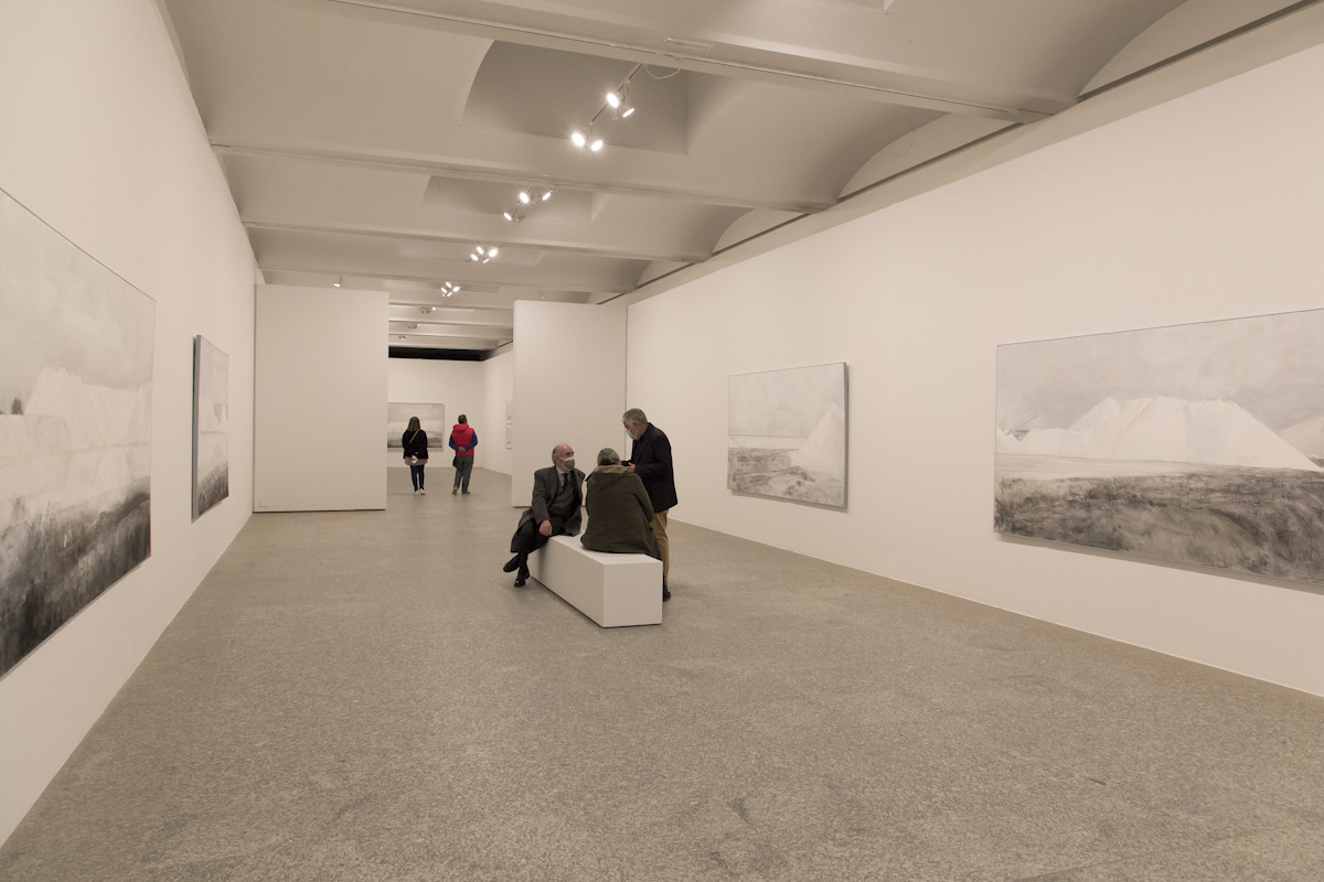 Las montañas de sal tienen una presencia rotunda pero no eluden cierto aspecto evanescente, casi espectral. Y además de las salinas, otro grupo de pinturas radicalmente diferente en su tratamiento del color, obras que comparten la misma intensidad lumínica y una composición articulada en torno a una férrea línea del horizonte. La muestra presenta también un importante conjunto de bajorrelieves en torno al mismo motivo, realizados en fechas recientes, que revelan de nuevo un interés por la línea del horizonte.