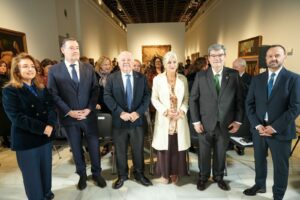 En la imagen, de izquierda a derecha: Valme Muñoz, directora del Museo de Bellas Artes de Sevilla; Miguel Zugaza, director del Museo de Bellas Artes de Bilbao; Jesús Aguirre, presidente del Parlamento de Andalucía; Patricia del Pozo, consejera de Cultura y Deporte de la Junta de Andalucía; Juan Mari Aburto, alcalde de Bilbao y presidente del Patronato de la Fundación Museo de Bellas Artes de Bilbao, y José Luis Merino, conservador de Arte Antiguo del Bellas Artes de Bilbao y comisario de la exposición.