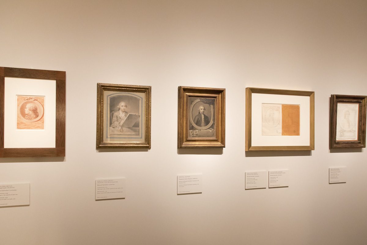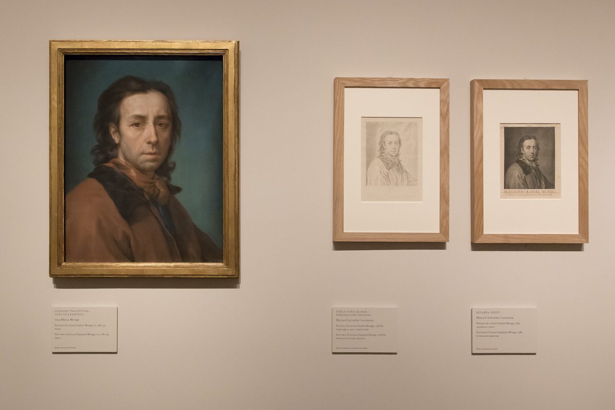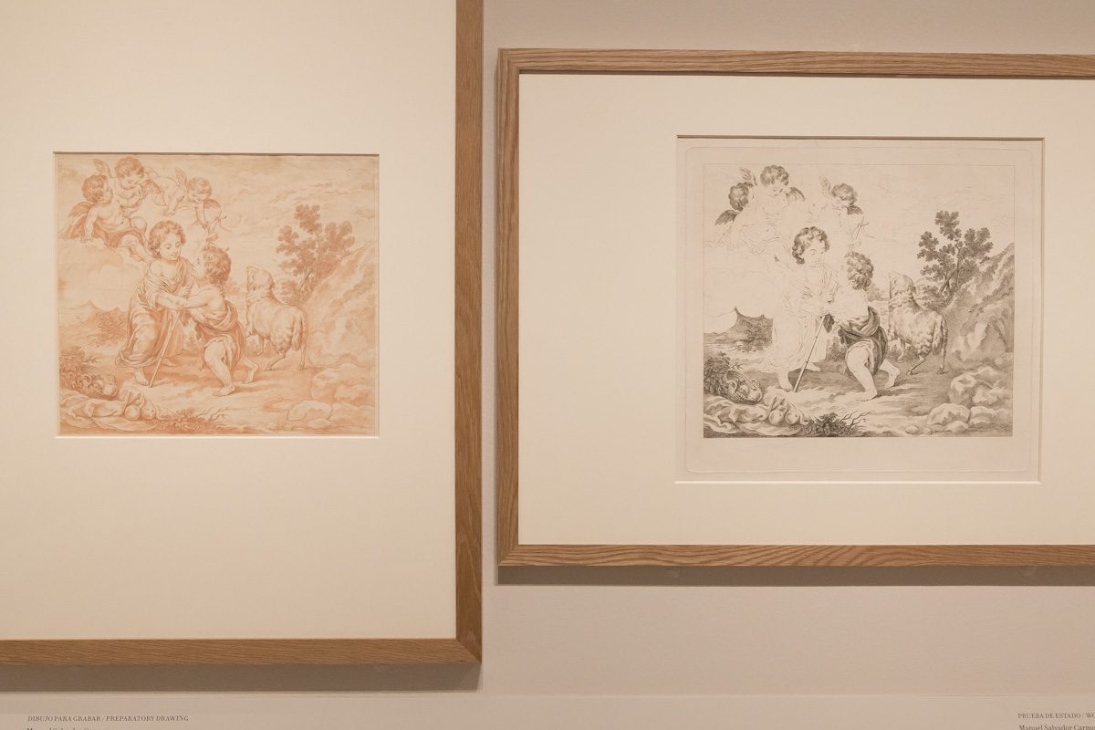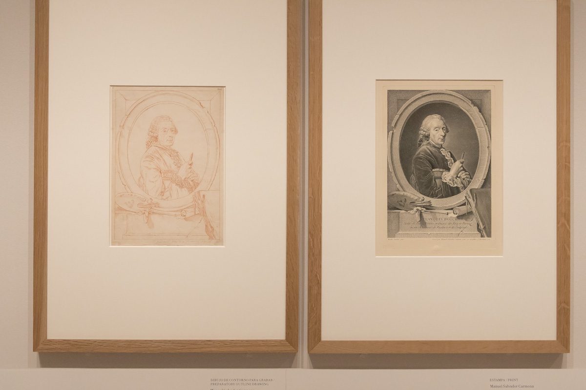 Aunque en la exposición se exhiben obras de varios autores, su eje gira en torno a dos figuras fundamentales en el desarrollo del arte del grabado, Manuel Salvador Carmona [1] (1734 – 1820), el artista que mejor dominó la técnica académica del buril en España, y Francisco de Goya [2] (1746 – 1828), cuya genialidad y particular entendimiento del aguafuerte abrió nuevos caminos a la creación.