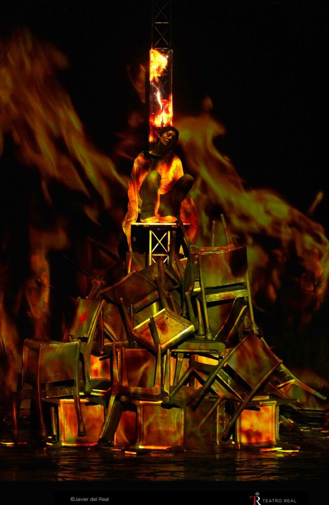 Plano general de la hoguera con Marion Cotillard (Juana de Arco), Charles Workman (Porcus), Coro Titular del Teatro Real y actores. © Javier del Real | Teatro Real.