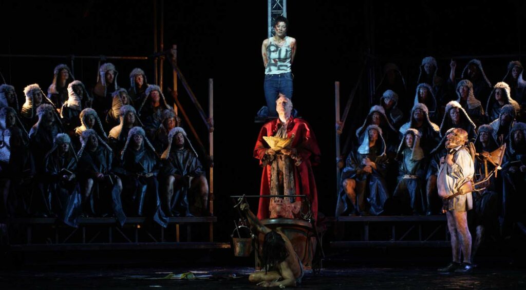 Ollé concibe la producción como una distopía, con un mundo arrasado por las mismas hordas que devastaron la Europa del siglo XV, el de Juana de Arco, la del XX, la de Claudel y Honegger, y lo siguen haciendo en el XXI: un universo de bestias manipuladoras y de chusmas gregarias del que solo la muerte, la espiritualidad y la fe nos pueden liberar.