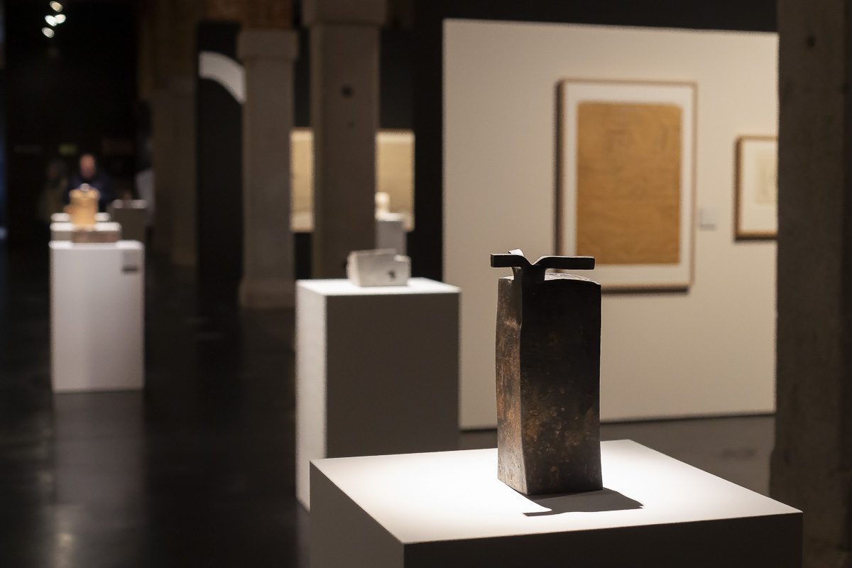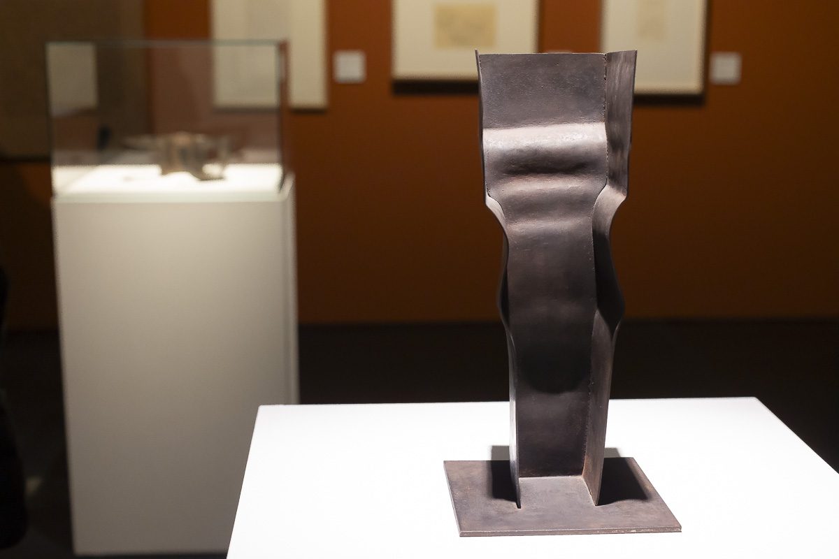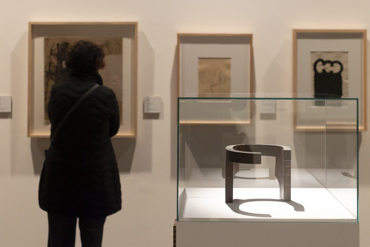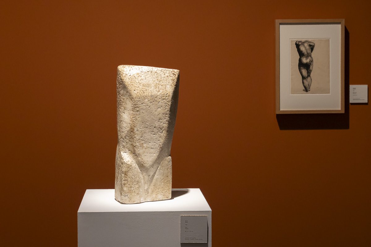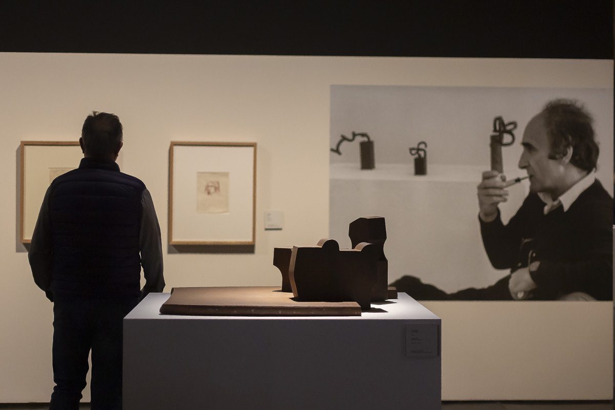 El conjunto reúne 102 trabajos entre esculturas y obra sobre papel, una selección que atraviesa distintas etapas y materiales. Veinte esculturas articulan el itinerario principal. Yeso, alabastro, hierro forjado, hormigón armado o tierra chamota conforman un paisaje matérico que refleja la coherencia de una trayectoria marcada por la experimentación.