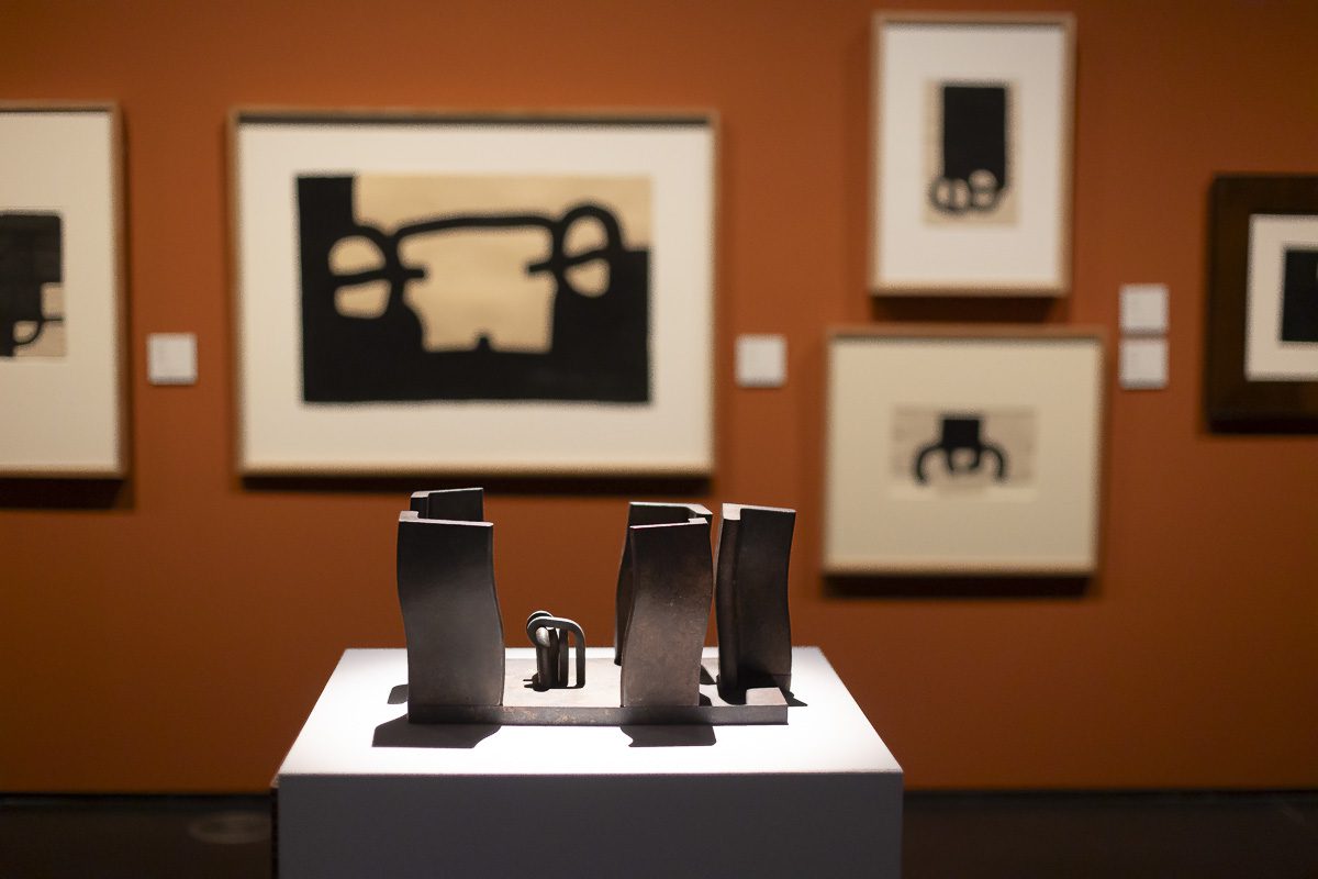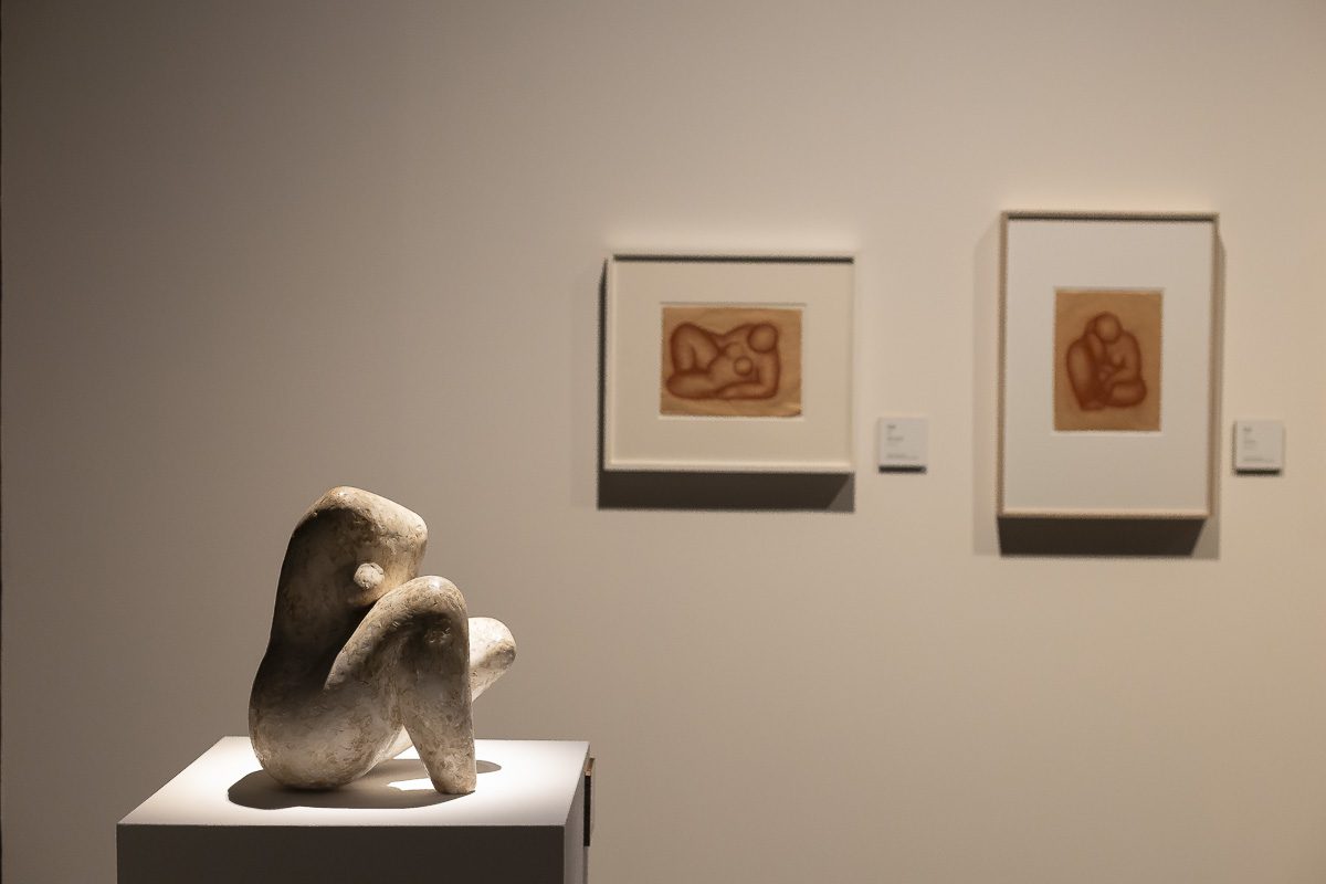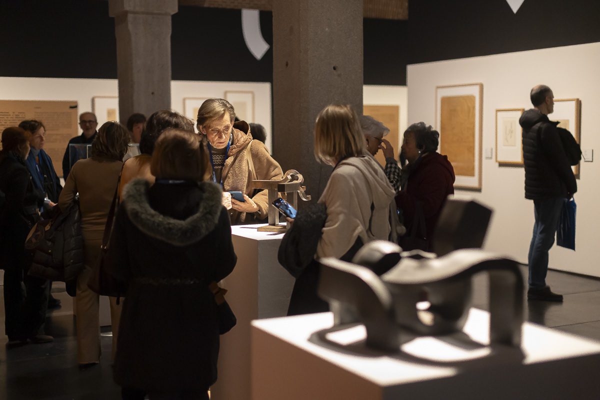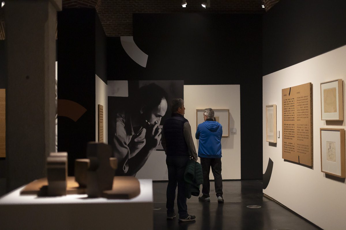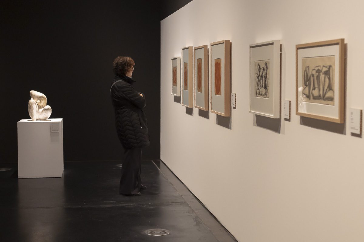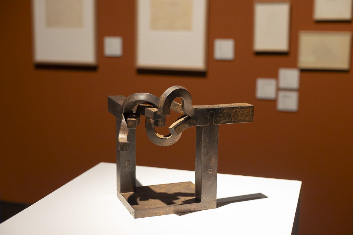 El conjunto reúne 102 trabajos entre esculturas y obra sobre papel, una selección que atraviesa distintas etapas y materiales. Veinte esculturas articulan el itinerario principal. Yeso, alabastro, hierro forjado, hormigón armado o tierra chamota conforman un paisaje matérico que refleja la coherencia de una trayectoria marcada por la experimentación.