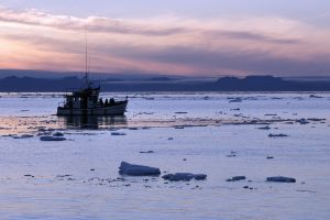 Barco navegando entre pequeños icebergs en el fiordo de Jakobshavn. Groenlandia © Andoni Canela