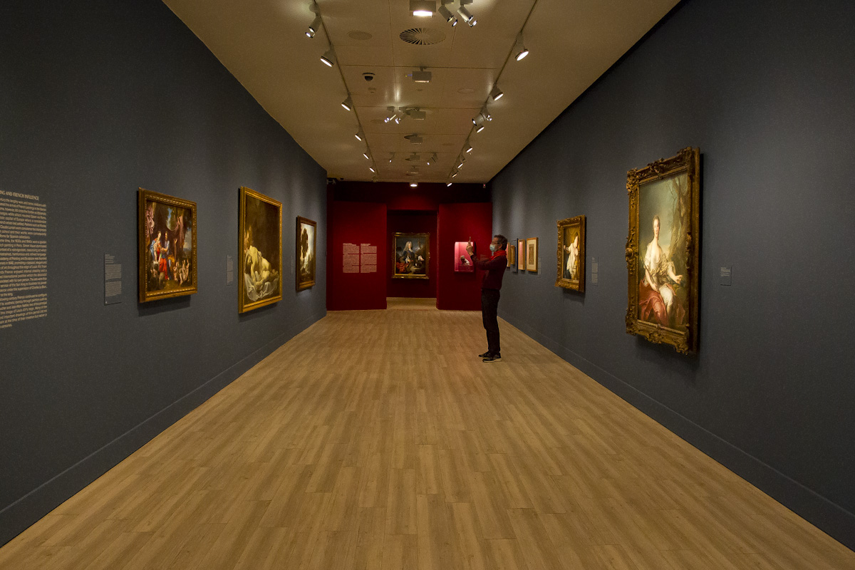 La muestra se divide en 10 secciones y un epilogo. Las iniciales abordan la llegada de las primeras piezas galas durante el reinado de Carlos II, último de los Habsburgo españoles, así como la edad de oro de la pintura de ese período. Se recorre a continuación la consolidación del gusto francés durante el gobierno de los Borbones