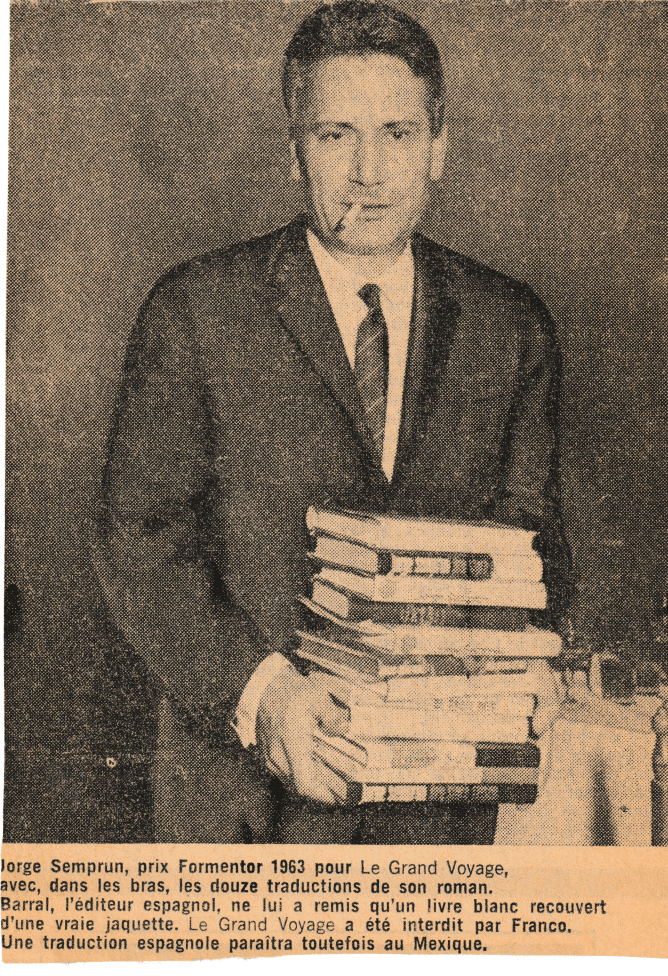Jorge Semprún posa con las primeras 12 traducciones de ‘Le grand voyage’, 1963 . Centre d’étude du protestantisme béarnais (C.E.P.B.).