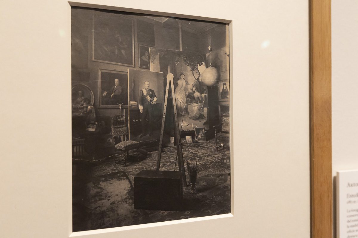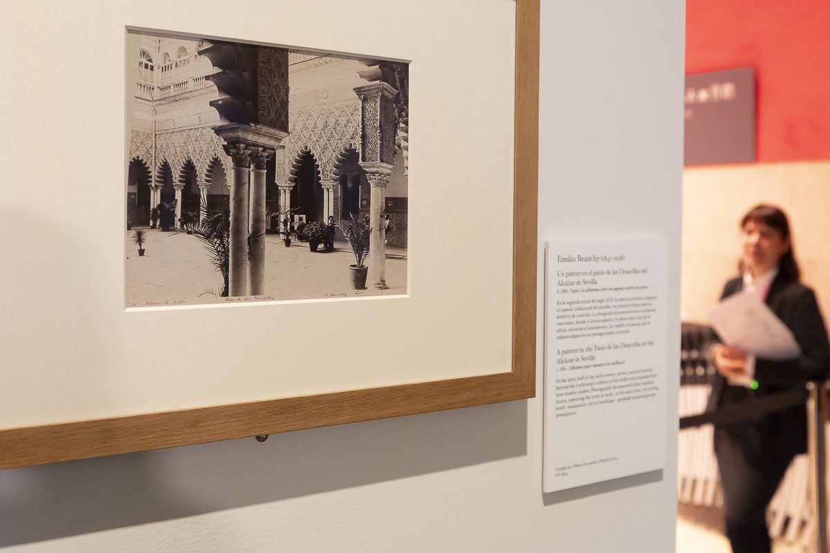 La muestra comisariada por Beatriz Sánchez Torija reúne obras de profesionales reconocidos junto a imágenes de autoría desconocida y posible carácter amateur, en su mayoría procedentes de archivos de artistas como Luis y Federico de Madrazo, Dióscoro Puebla, Rafael Rocafull, Cecilio Pla, Agustín Querol, Miguel Blay, Fernanda Francés o Manuel González Santos. Ese conjunto permite adentrarse en el estudio como un espacio cargado de valor simbólico donde convergen la observación, la enseñanza y el intercambio, y también seguir al artista en otros escenarios de creación que se convierten en prolongaciones del taller, desde el célebre atelier de Mariano Fortuny en Roma hasta el evocador patio de las Doncellas del Real Alcázar de Sevilla.