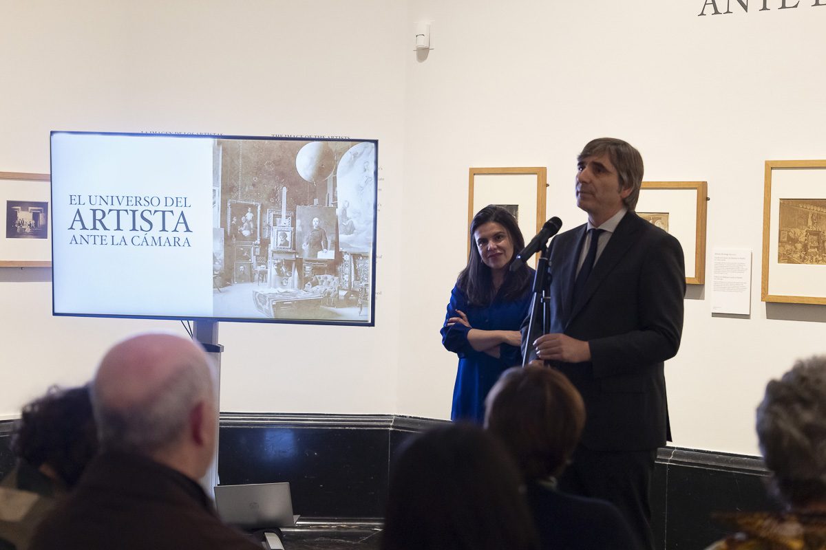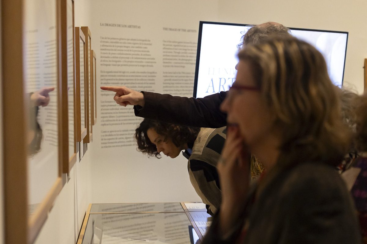 La llegada de la fotografía ofreció la posibilidad de fijar escenas con gran precisión y realismo. Los artistas posaron ante la cámara, solos o en grupo; registraron sus talleres y documentaron tanto el proceso como la culminación de sus obras. El retrato —uno de los primeros géneros asumidos por el nuevo medio— funcionó como afirmación de identidad y estatus a través de poses meditadas, atributos significativos e indumentarias asociadas al oficio. La expansión social de los estudios fotográficos en la segunda mitad del siglo, a menudo ubicados en plantas altas con grandes ventanales para aprovechar la luz natural, impulsó la aparición de formatos como la carte de visite, la tarjeta promenade o la tarjeta París para el retrato individual, mientras que las composiciones de grupo encontraron en soportes de mayor tamaño el vehículo idóneo para escenificar pertenencias y celebraciones.