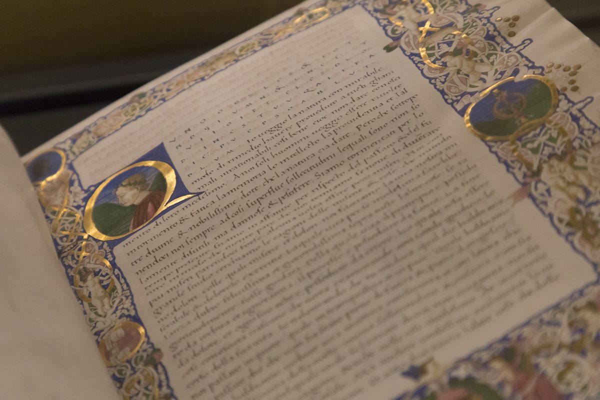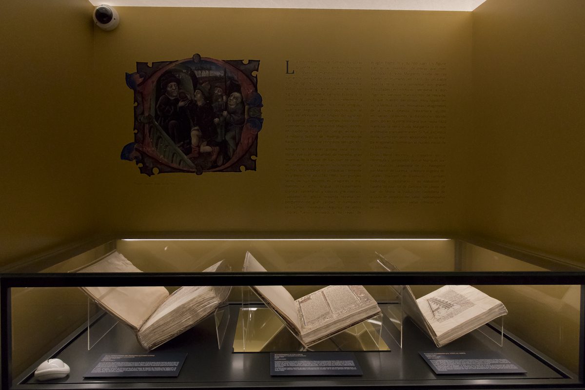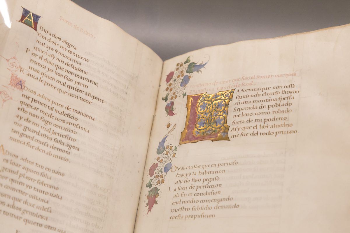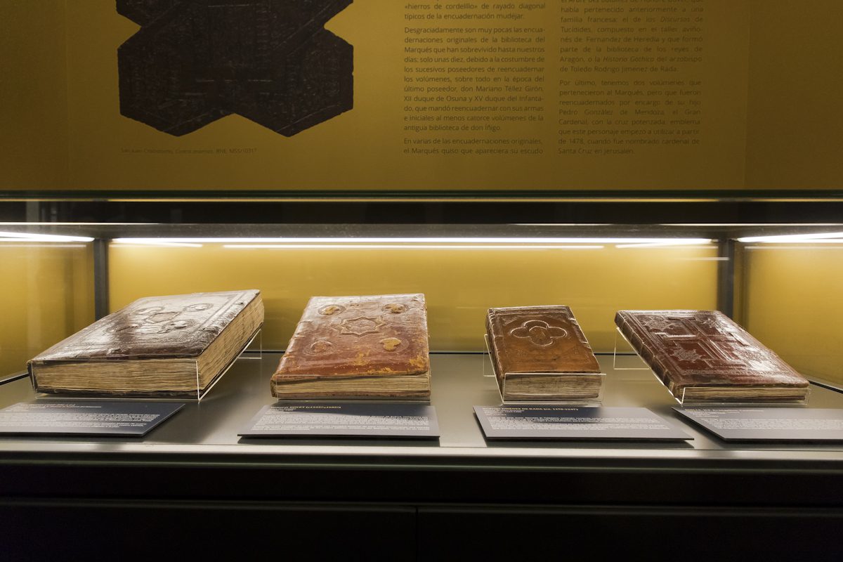 Los 15 manuscritos suntuosamente iluminados que incluye la muestra, procedentes en su mayoría de la Biblioteca Nacional, son destacados ejemplares del libro de lujo del siglo XV y sirven para poner de manifiesto los innovadores gustos estéticos de López de Mendoza, que van desde la aceptación de las propuestas del realismo flamenco hasta las renovadoras decoraciones desarrolladas en la Italia del Renacimiento. Junto a ellos se exhiben también un relieve con la efigie de Alfonso V El Magnánimo y dos medallas de Pisanello.