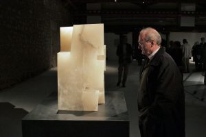 Ignacio Chillida observando la obra de su padre, Homenaje a la arquitectura II, 2000. Alabastro. Foto Sonia Aguilera