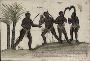 Dibujo de varios indígenas de las islas Nuevas Hébridas, con su armamento (1606).