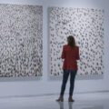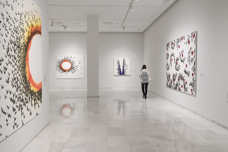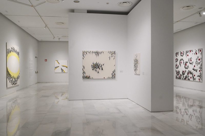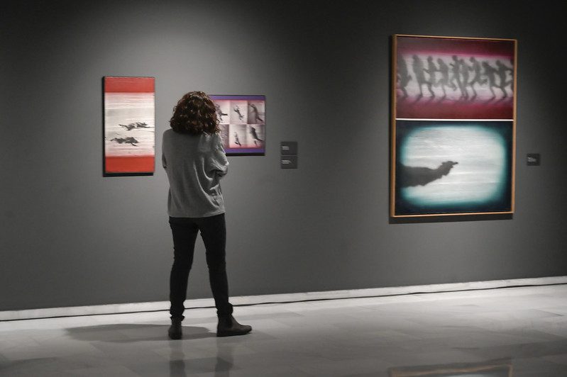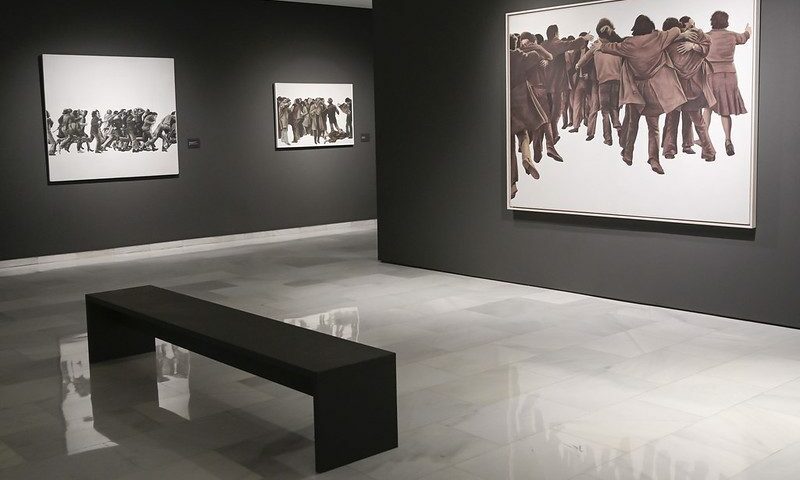 Integrada por más de 70 obras –procedentes de colecciones particulares y de más de 25 instituciones prestadoras–, la exposición cuenta con algunas de sus creaciones más icónicas, como El abrazo (1976), perteneciente a la Colección del Museo Reina Sofía, aunque en depósito en el Congreso de los Diputados, así como otras inéditas que se presentan por primera vez al público, entre ellas el lienzo en el que estaba trabajando en el momento de su fallecimiento.