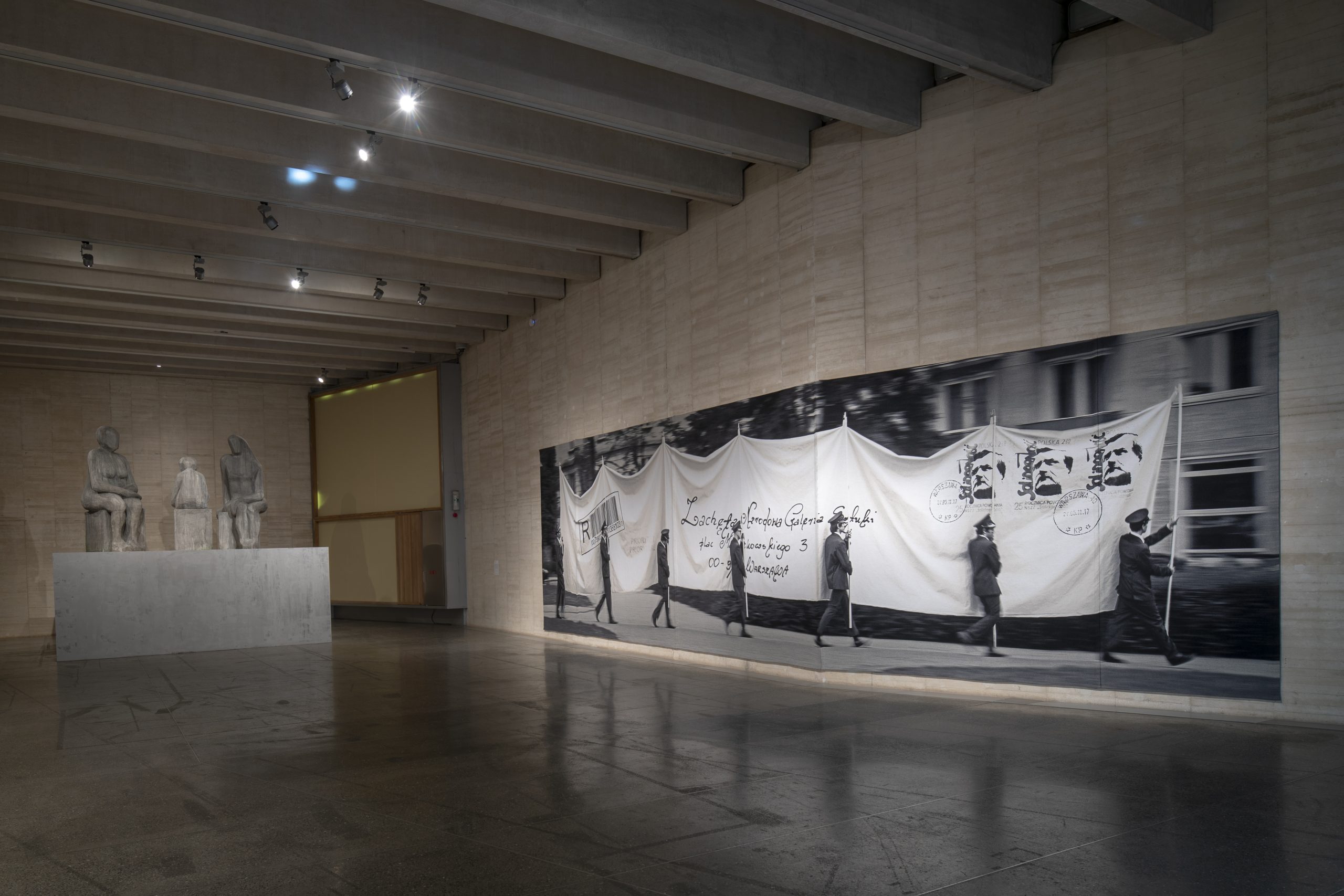 El título de la exposición, IN FLUX, que en español se podría traducir como “en flujo” o “en movimiento” alude a la constante circulación de las imágenes y a los hechos; a la persistencia cíclica de ciertos episodios históricos, a las variaciones histórica de hechos del pasado, a las inercias recurrentes… Una idea que se adecúa al método que utiliza Macuga, en cuanto a su constante uso de referentes del pasado y resignificado en el presente, tanto en relación a imágenes como a disciplinas artísticas.