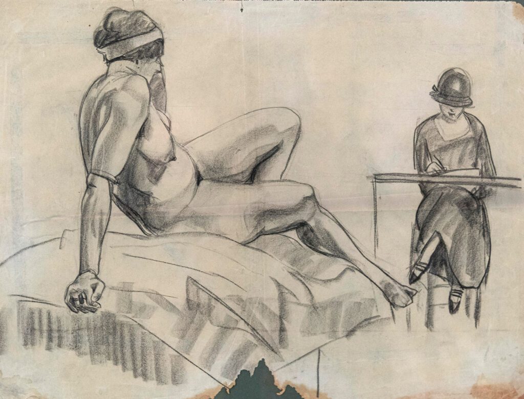 José Manaut Viglietti. «Desnudo de mujer y otra pintando». París, 1923-1927. Carboncillo sobre papel. Colección Manaut.