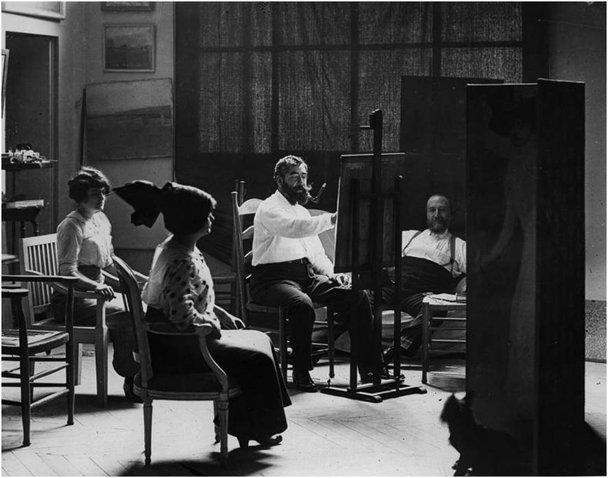 Taller de Casas en la calle Descartes, 1, de Sant Gervasi, Barcelona. En primer plano aparece Júlia Peraire, c. 1914.