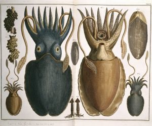 Calamar gigante. Albertus Seba Locupletissimi Rerum, Naturalium Thesaurus, Vol 3., 1759.