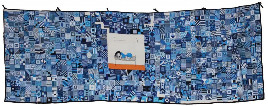 Lágrimas Negras es un inmenso tapiz de 2×14 metros, una obra de arte resultante de la creación colectiva, que ha implicado la participación de 2.245 mujeres de 46 países. La obra está formada por una pieza central (90 x 90 cm) que representa a una mujer acostada sobre un banco, a la que se le ha parado el corazón de dolor. A esta pieza se han añadido 1.962 pequeños tapices confeccionados por las distintas mujeres que han participado en el proyecto. Dichas piezas representan las “lágrimas vertidas por las mujeres, cuyos derechos humanos se violan a diario”.